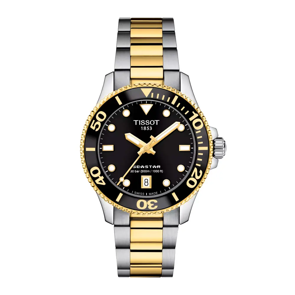 Tissot Seastar 1000 36mm T120.210.22.051.00 mang đến hiệu suất lặn chuyên nghiệp, độ chính xác Thụy Sĩ và phong cách tinh tế trong thiết kế nhỏ gọn. Vỏ thép không gỉ 316L 36mm phủ PVD hai tông vàng kết hợp mặt số đen với kim và cọc số phát sáng, dễ đọc trong mọi điều kiện ánh sáng.