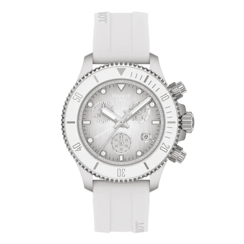 Tissot Seastar 1000 Chronograph T120.217.17.011.00 là mẫu đồng hồ thể thao dành cho nữ, kết hợp khả năng lặn chuyên nghiệp, phong cách hiện đại và độ chính xác Thụy Sĩ. Vỏ thép 316L 38 mm đi cùng dây silicone trắng mang đến sự nhẹ nhàng, thoải mái và phù hợp với lối sống năng động. Sự hòa quyện giữa tính thể thao và những chi tiết thanh lịch giúp mẫu đồng hồ này trở thành điểm nhấn lý tưởng cho phong cách hằng ngày.