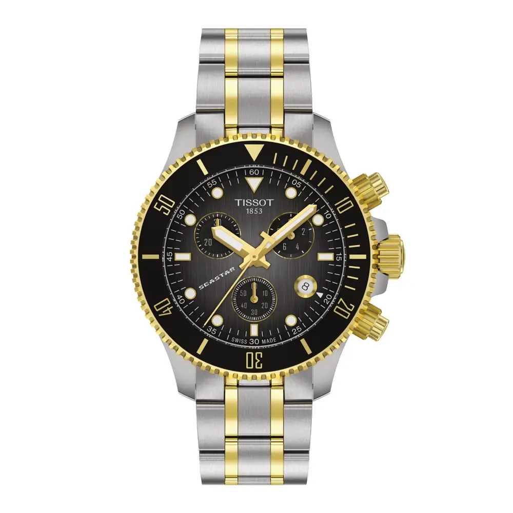 Tissot Seastar 1000 Chronograph T120.217.22.061.00 kết hợp khả năng lặn chuyên nghiệp, độ bền và độ chính xác Thụy Sĩ trong vỏ thép 38 mm nhỏ gọn. Dây thép PVD hai tông màu và mặt số xám tạo nên vẻ thể thao nhưng dễ ứng dụng hàng ngày.