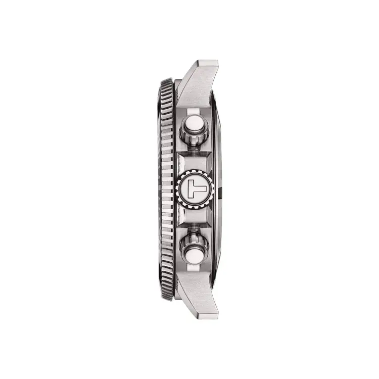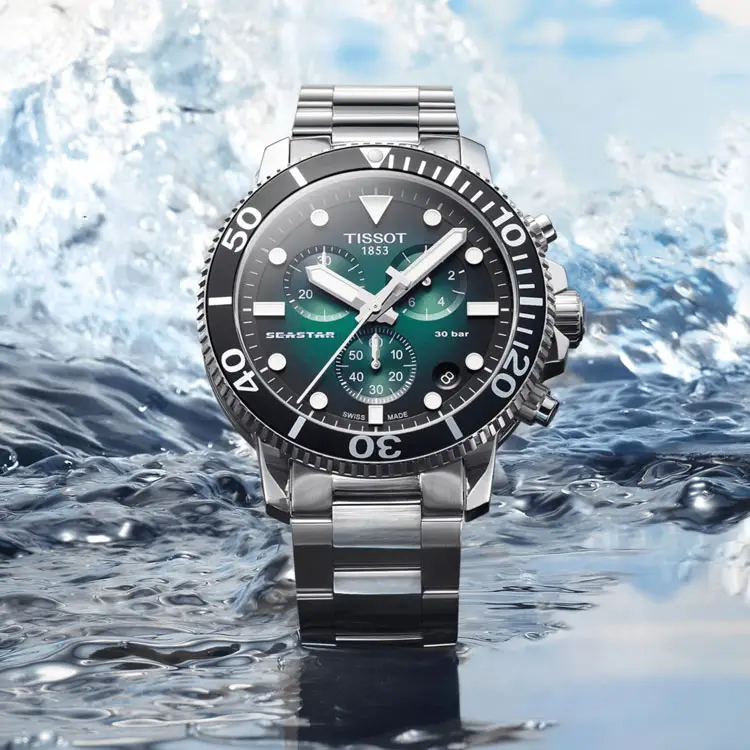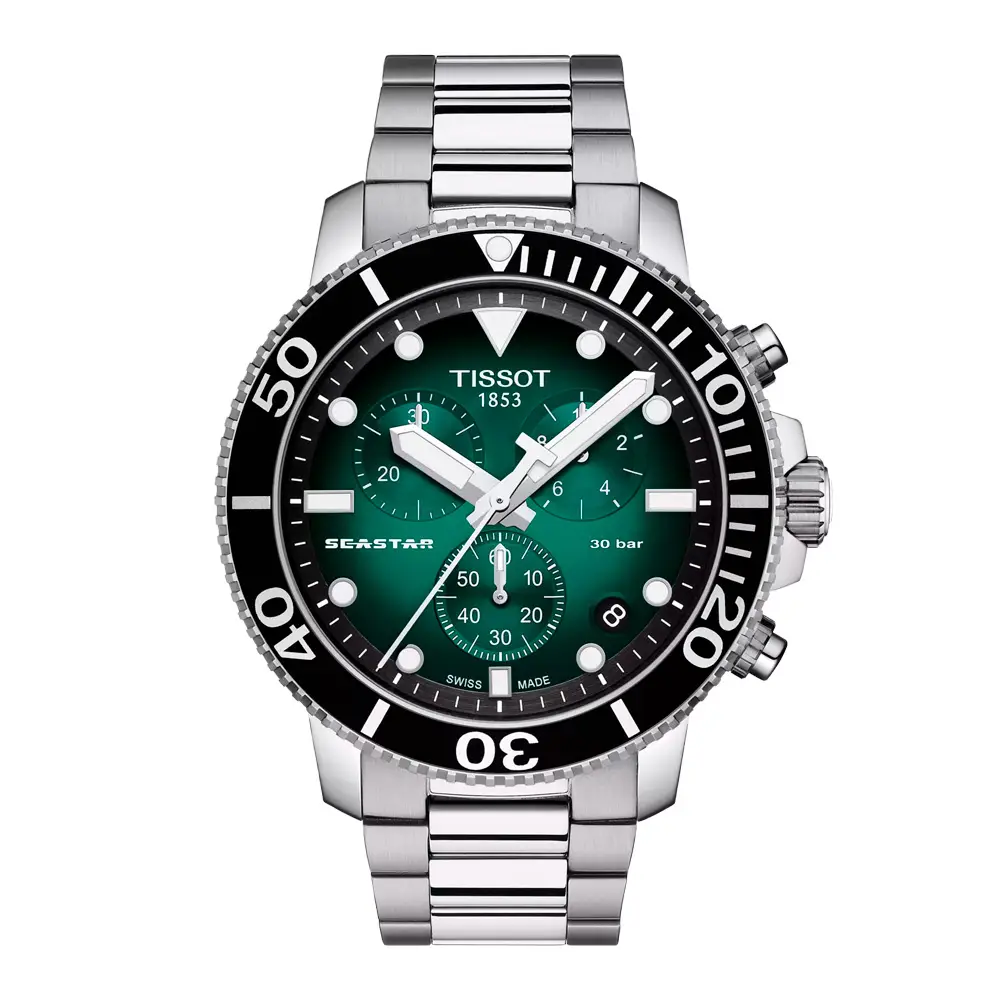 Tissot Seastar 1000 Quartz Chronograph là mẫu đồng hồ thể thao chắc chắn dành cho người yêu thích lặn và các môn thể thao dưới nước. Đồng hồ có vỏ thép không gỉ 45,5 mm, mặt số xanh ánh sunburst và vành bezel nhôm xoay một chiều. Núm vặn và nút bấm dạng vặn giúp đồng hồ chống nước lên đến 300 mét (30 ATM).