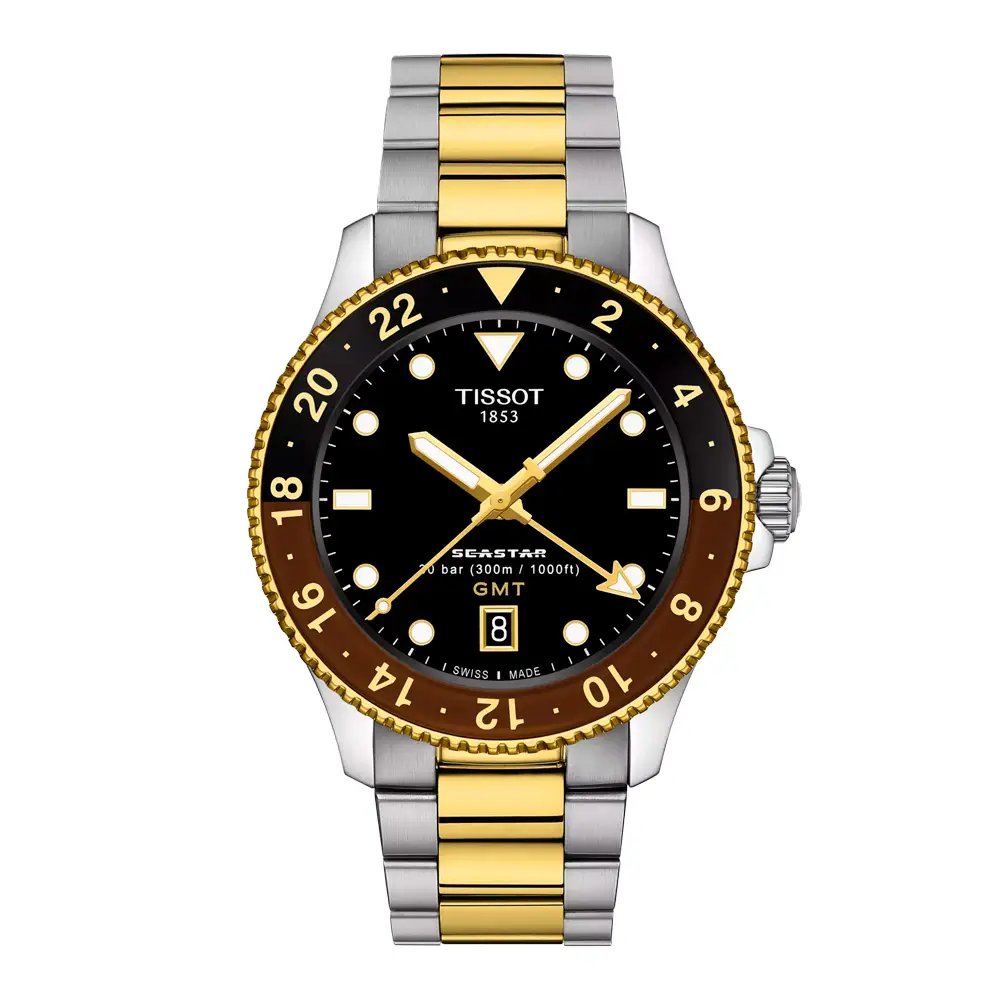 Tissot Seastar 1000 Quartz GMT T120.852.22.051.00 kết hợp giữa hiệu suất của đồng hồ lặn chuyên nghiệp và tính tiện dụng của chức năng múi giờ kép (GMT). Vỏ thép không gỉ 316L 40mm phủ PVD hai tông màu đi kèm vòng bezel xoay 24 giờ và mặt số đen với cọc số phủ dạ quang, giúp hiển thị rõ ràng cả dưới nước và khi di chuyển.