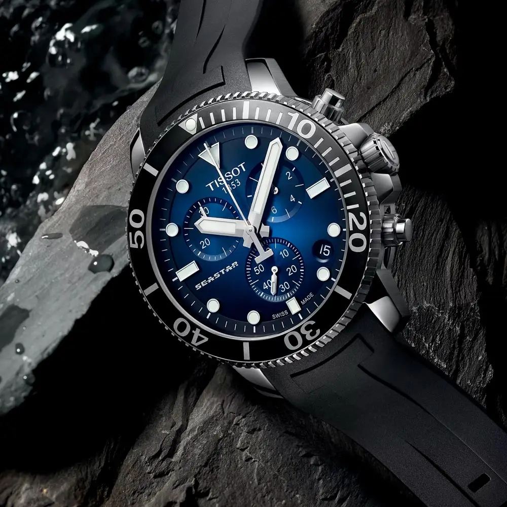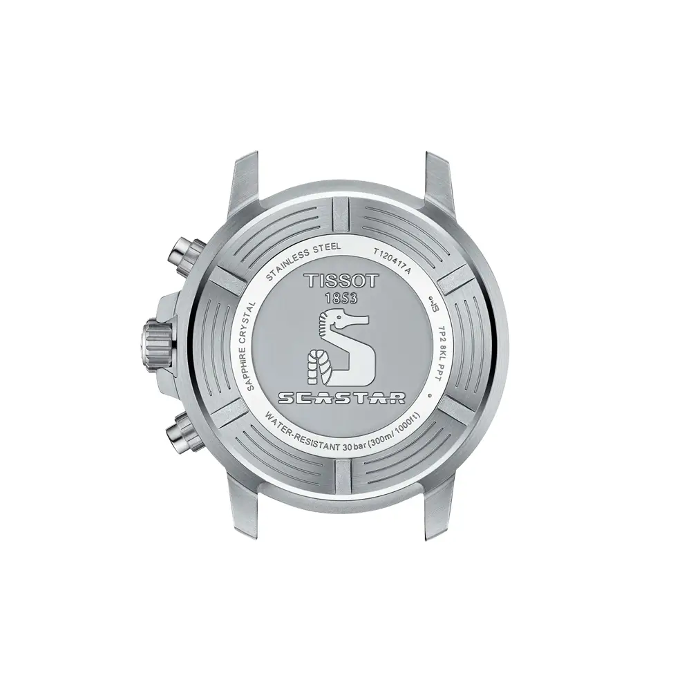 Tissot Seastar 1000 Quartz T120.417.17.041.00 là sự kết hợp hoàn hảo giữa khả năng lặn chuyên nghiệp, thiết kế hiện đại và độ chính xác Thụy Sĩ. Vỏ thép không gỉ 45,5 mm đi kèm mặt số xanh lam với các cọc số và kim phủ dạ quang, mang đến khả năng hiển thị tuyệt vời dưới nước. Vành bezel gốm xoay một chiều và núm vặn khóa thể hiện rõ phong cách đồng hồ lặn chuyên nghiệp.
