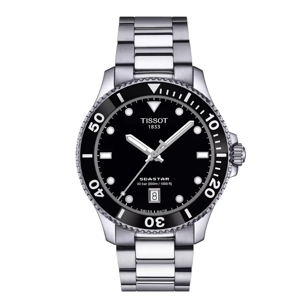 Tissot Seastar 1000 40 mm T120.410.11.051.00 là mẫu đồng hồ lặn thể thao, kết hợp độ bền kỹ thuật với thiết kế sạch và dễ ứng dụng cho cả ngày thường lẫn hoạt động ngoài trời. Mặt số màu đen với cọc số tương phản và kim Super-LumiNova® cho khả năng quan sát tốt trong mọi điều kiện ánh sáng.