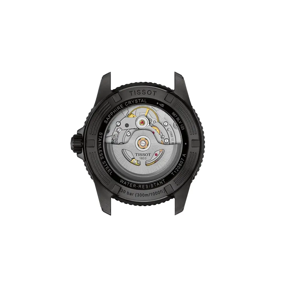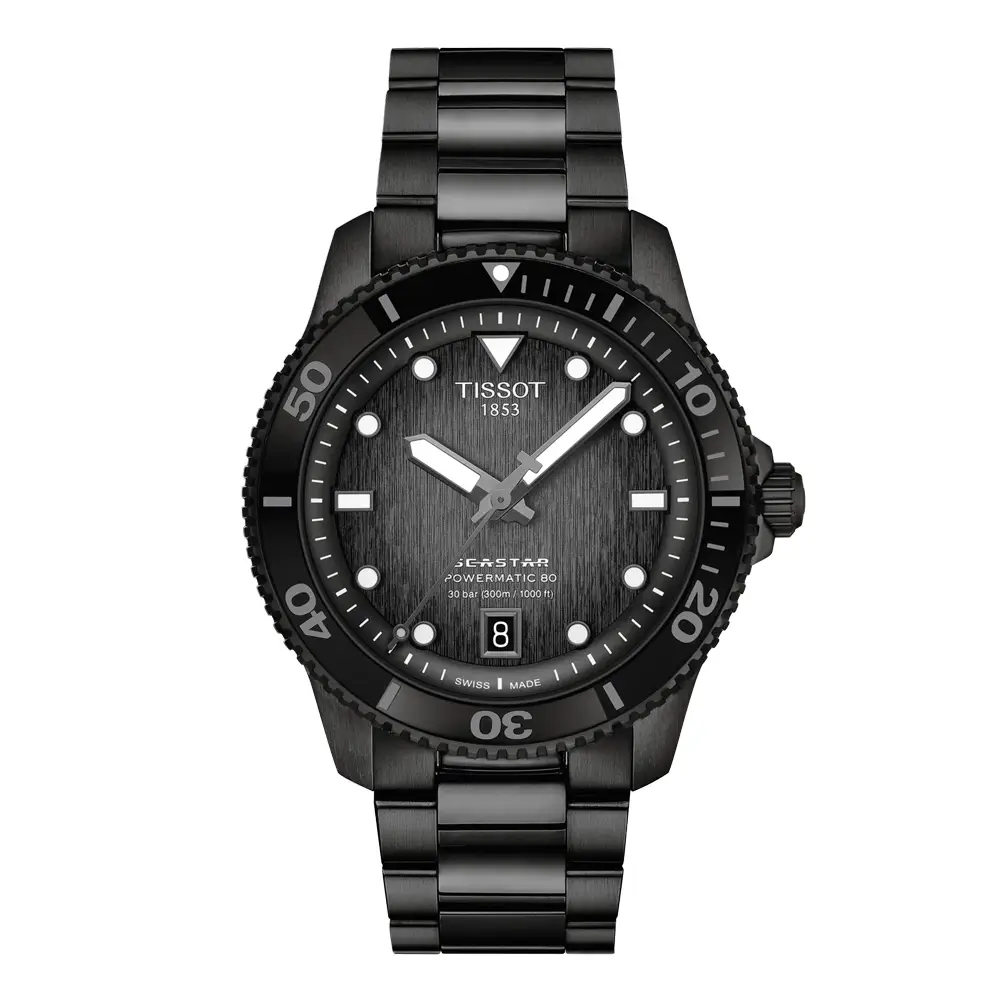 Tissot Seastar 1000 Powermatic 80 T120.807.33.051.00 kết hợp phong cách thể thao hiện đại với độ bền vượt trội. Vỏ thép PVD đen 40 mm cùng mặt số xám Super-LumiNova® mang lại khả năng đọc rõ ràng và vẻ ngoài chuẩn đồng hồ lặn. Vành bezel xoay một chiều nhấn mạnh tính chuyên nghiệp.