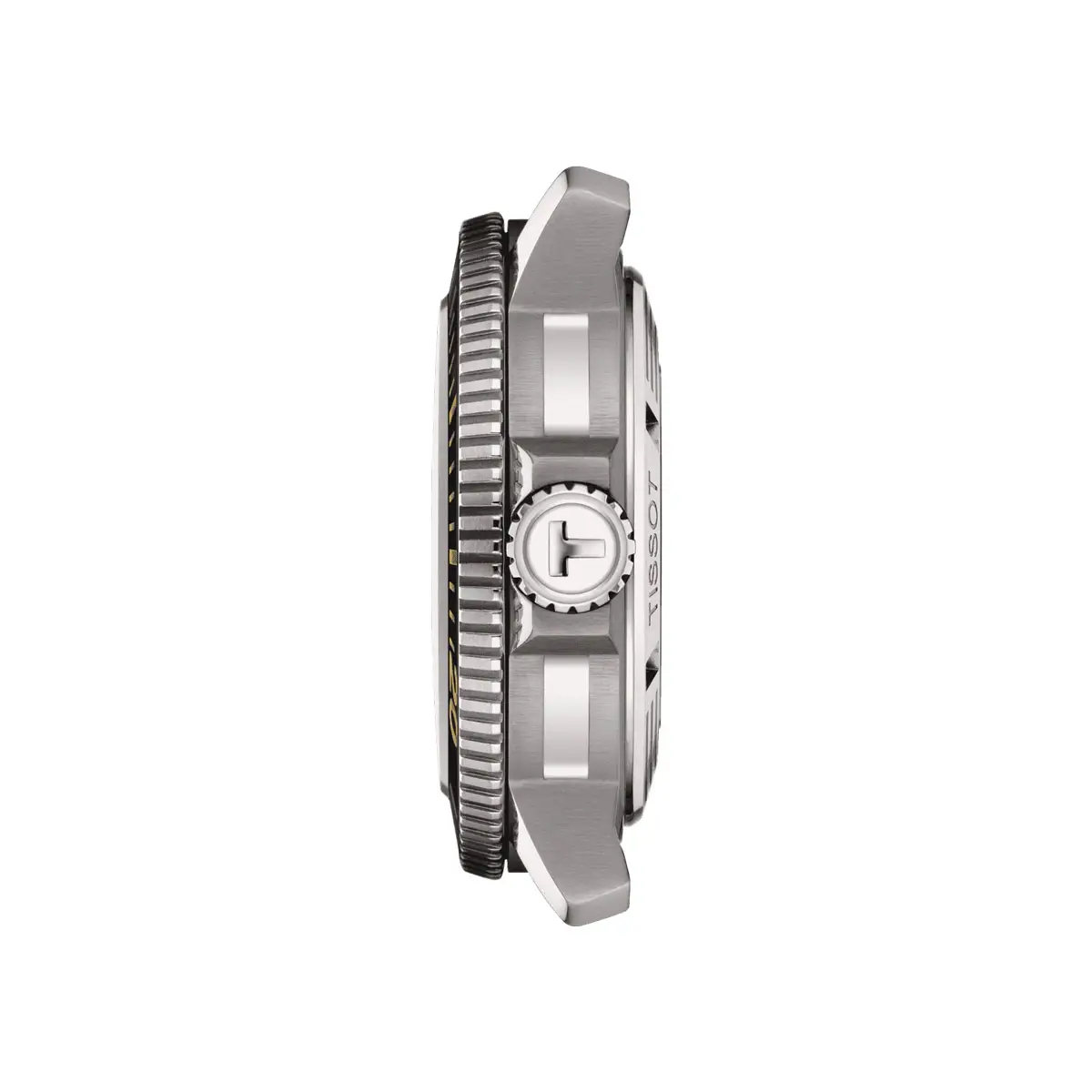 Tissot Seastar 2000 Professional Powermatic 80 T120.607.17.441.01 thể hiện hiệu suất chuyên nghiệp và độ chính xác Thụy Sĩ. Vỏ thép không gỉ 46 mm đi kèm mặt số xanh lam chuyển sắc họa tiết sóng biển, vành bezel gốm xoay một chiều và núm vặn khóa, đảm bảo khả năng chống nước lên đến 600 m (60 bar). Kim và cọc số phủ dạ quang giúp dễ đọc ngay cả ở độ sâu đại dương.