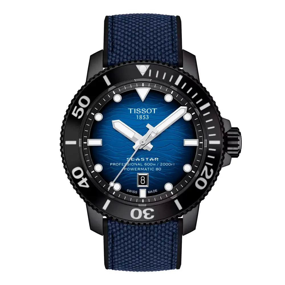 Tissot Seastar 2000 Professional Automatic T120.607.37.041.00 là biểu tượng của hiệu suất chuyên nghiệp, thiết kế hiện đại và độ chính xác Thụy Sĩ. Vỏ thép không gỉ 46 mm phủ PVD đen đi kèm mặt số xanh lam chuyển sắc họa tiết sóng biển, cùng kim và cọc số phủ dạ quang giúp dễ đọc dưới nước. Vành bezel gốm xoay một chiều và núm vặn khóa nhấn mạnh phong cách đồng hồ lặn chuyên nghiệp.