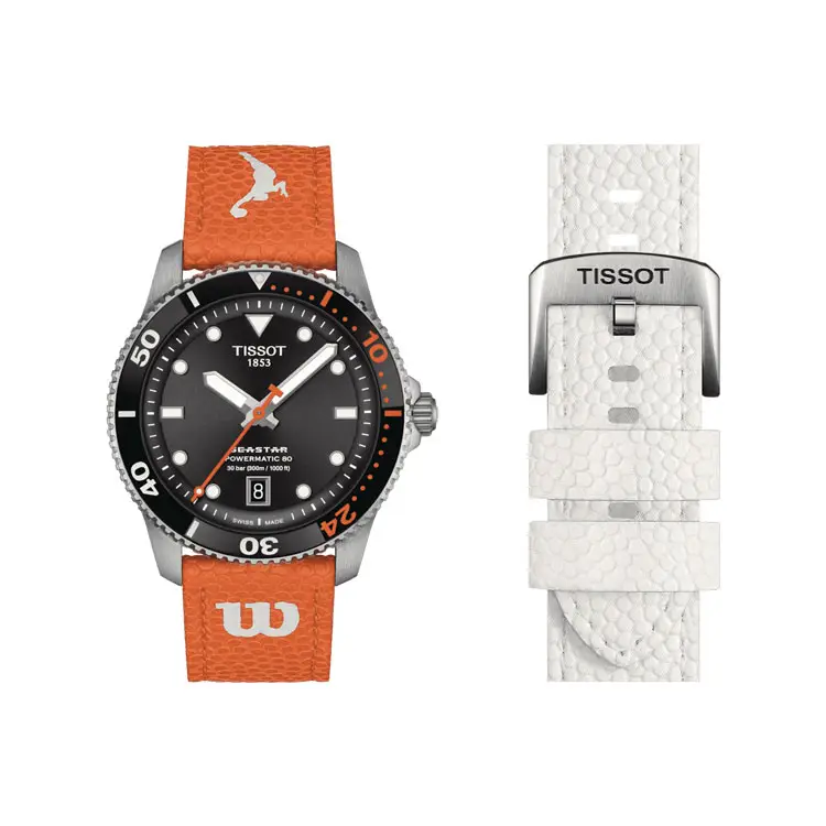 Tissot Seastar Wilson WNBA T120.807.17.051.00 là mẫu đồng hồ lặn vừa thể thao vừa thanh lịch, lấy cảm hứng từ năng lượng của bóng rổ nữ. Vỏ tròn bằng thép không gỉ đường kính 40 mm được trang bị vành bezel gốm và bảo vệ bởi kính sapphire chống trầy xước. Mặt số màu đen với các chi tiết dạ quang nổi bật có lịch ngày tại vị trí 6 giờ.