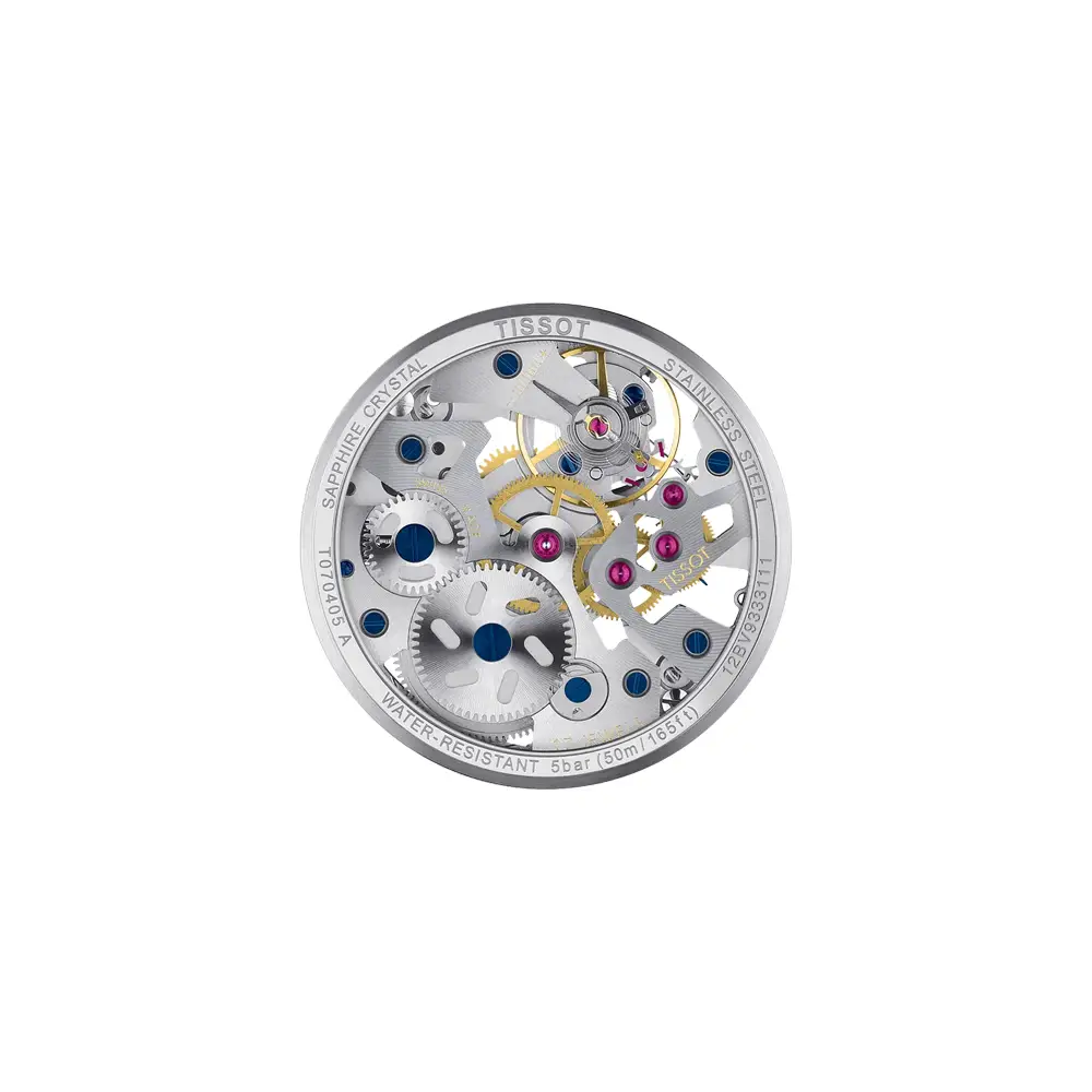 Tissot T-Complication Squelette T070.405.16.411.00 kết hợp hoàn hảo giữa nghệ thuật chế tác đồng hồ Thụy Sĩ truyền thống và thiết kế kỹ thuật hiện đại. Điểm nổi bật nhất là mặt số skeleton, cho phép nhìn thấy bộ máy cơ ETA 6497-1 lên cót tay, 17 chân kính, tần số 18.000 nhịp/giờ và trữ cót khoảng 46 giờ. Nắp lưng trong suốt giúp quan sát bộ máy từ cả hai phía, tạo nên vẻ đẹp cuốn hút cho người yêu đồng hồ cơ.