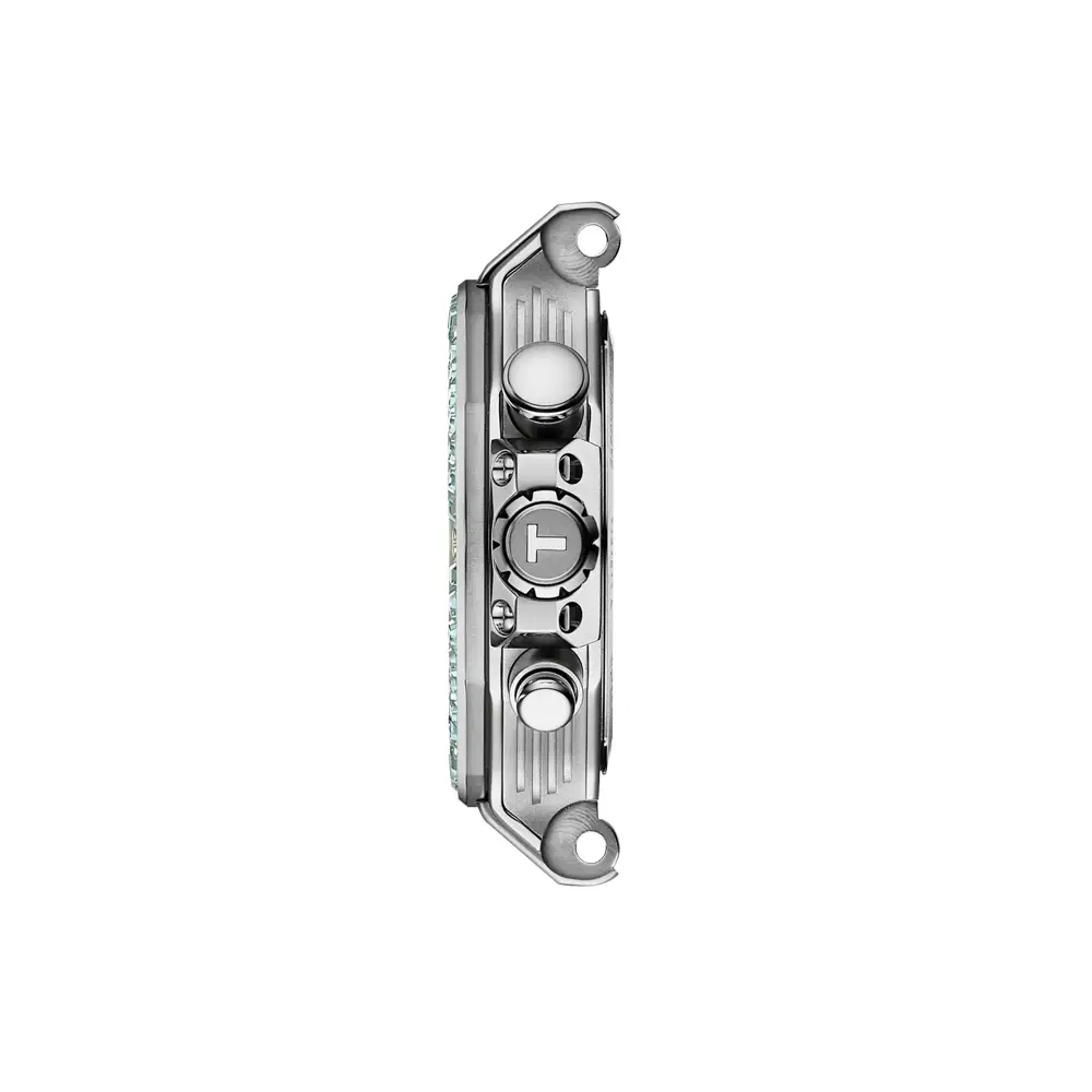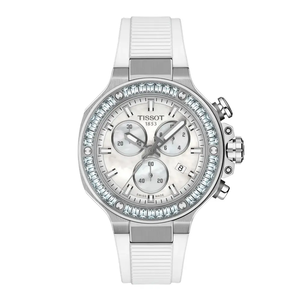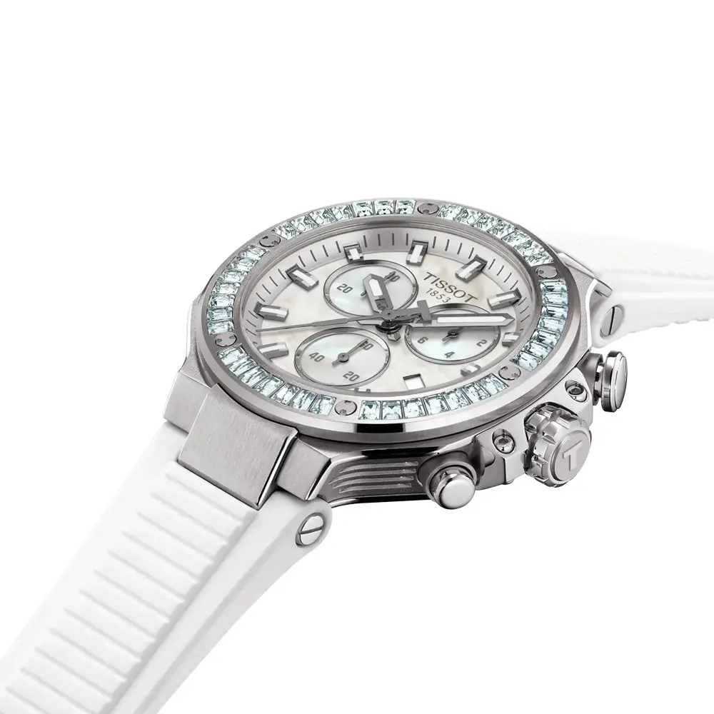 Mẫu T-Race kết hợp thiết kế lấy cảm hứng từ đua xe với phong cách sáng và thanh lịch — mặt số xà cừ trắng cùng dây silicone trắng tạo nên vẻ đẹp hiện đại, nữ tính nhưng vẫn rất thực dụng. Vỏ thép 316L và vành bezel đính đá mang đến điểm nhấn sang trọng, trong khi các đường nét vỏ đồng hồ gợi nhớ tinh thần mạnh mẽ của dòng T-Race.