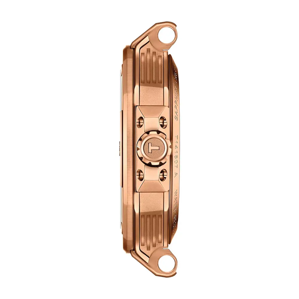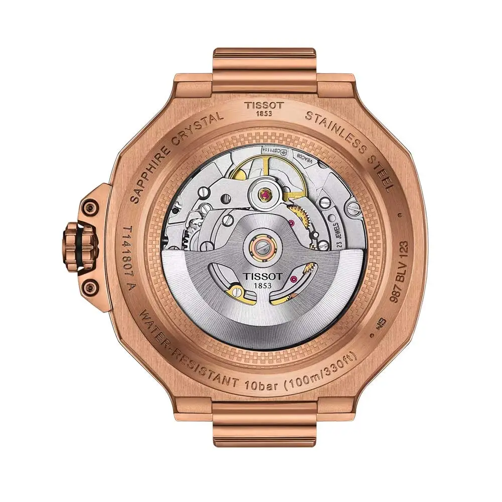 Tissot T-Race Powermatic 80 41mm T141.807.37.051.00 mang tinh thần đua xe thể thao và kỹ thuật chế tác đồng hồ Thụy Sĩ trong một thiết kế mạnh mẽ. Vỏ thép không gỉ 316L 41mm phủ PVD vàng hồng, kết hợp mặt số đen họa tiết với cọc số nổi bật, lấy cảm hứng từ bảng đồng hồ mô-tô.