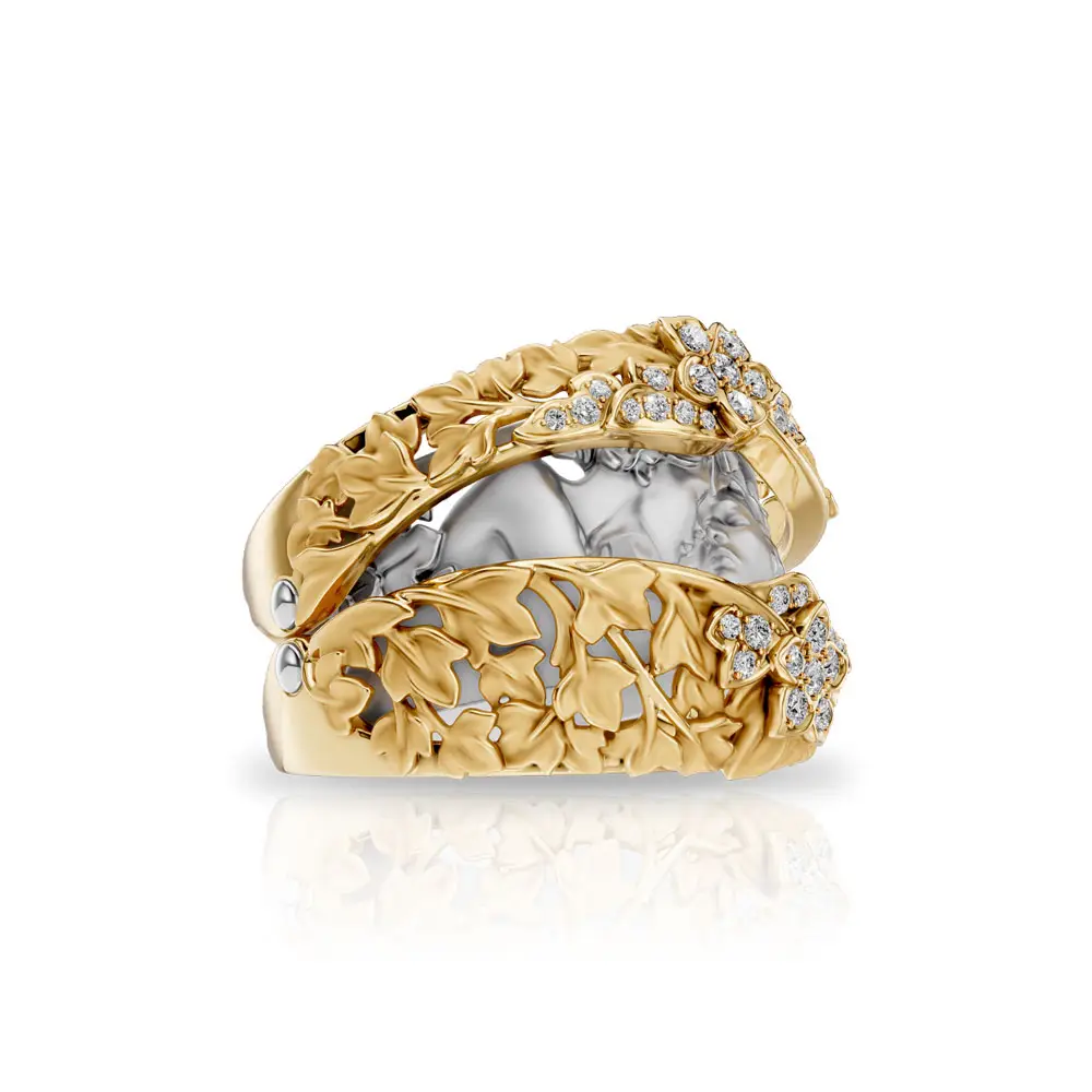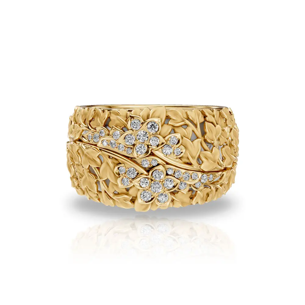 Carrera y Carrera Secret là một chiếc nhẫn biểu tượng vượt qua giới hạn của nghệ thuật chế tác trang sức truyền thống và biến thành một tác phẩm nghệ thuật mang đậm cảm xúc sâu lắng. Chiếc nhẫn này, được chế tác từ vàng 18k kết hợp, gây ấn tượng ngay từ cái nhìn đầu tiên với họa tiết hoa văn phong phú, hài hòa giữa ánh sáng lấp lánh và bề mặt mờ, được tô điểm bởi 36 viên kim cương được cắt gọt tinh xảo, tổng trọng lượng 0.27 carat.
