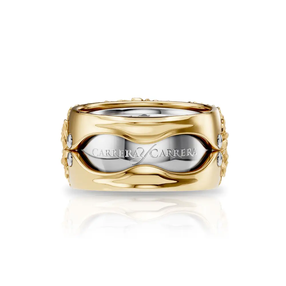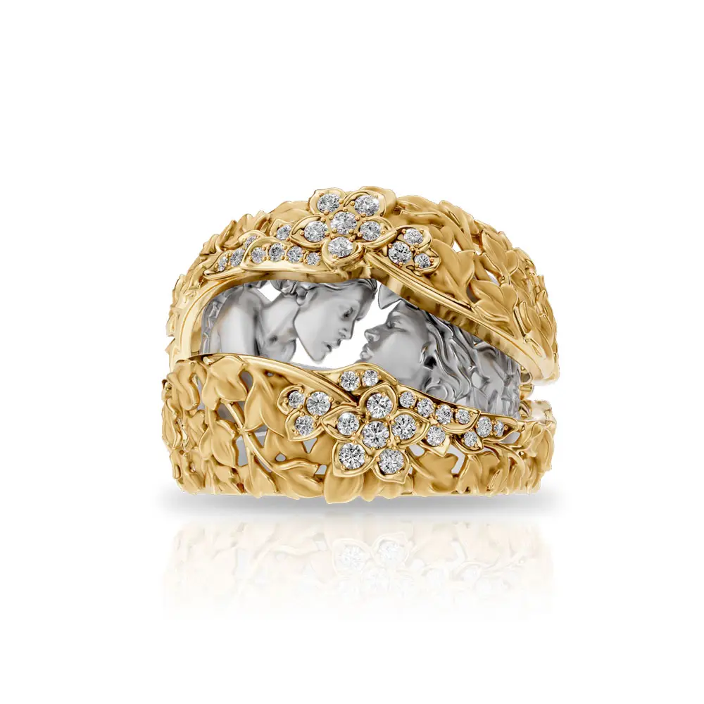 Tuy nhiên, cơ chế mở độc đáo được thiết kế tinh xảo tiết lộ điều quý giá nhất - một cảnh tượng tình yêu riêng tư được chạm khắc bên trong nhẫn với sự tinh tế và chiều sâu cảm xúc tuyệt vời. Cảnh tượng ẩn giấu này là sự ca ngợi tình yêu, đam mê và sự kết nối giữa hai tâm hồn, được thể hiện qua sự hoàn hảo điêu khắc đặc trưng của Carrera y Carrera.