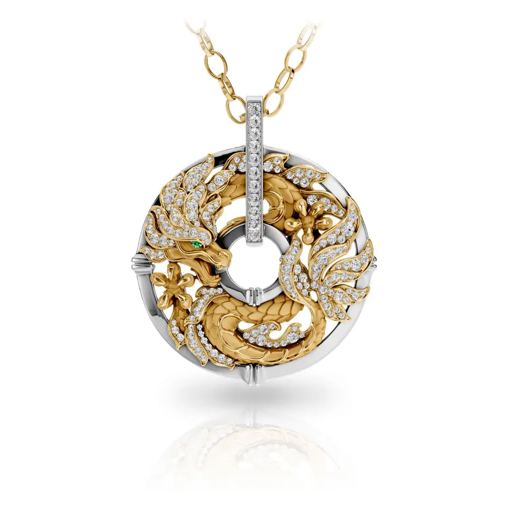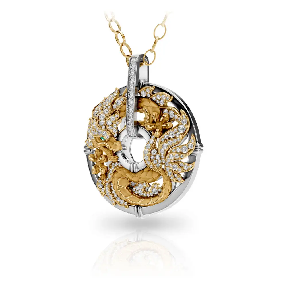Mặt dây chuyền được treo trên một sợi dây chuyền thanh lịch dài 45 cm , ôm sát cổ và tôn lên vẻ đẹp độc đáo của tác phẩm nghệ thuật này. Bộ sưu tập New Shanghai là lời tri ân dành cho văn hóa phương Đông, với mỗi chi tiết trang sức đều mang ý nghĩa của sức mạnh, may mắn và sự bảo vệ. Trang sức này được tạo ra dành cho những phụ nữ có phong cách riêng biệt và khao khát sự độc quyền.