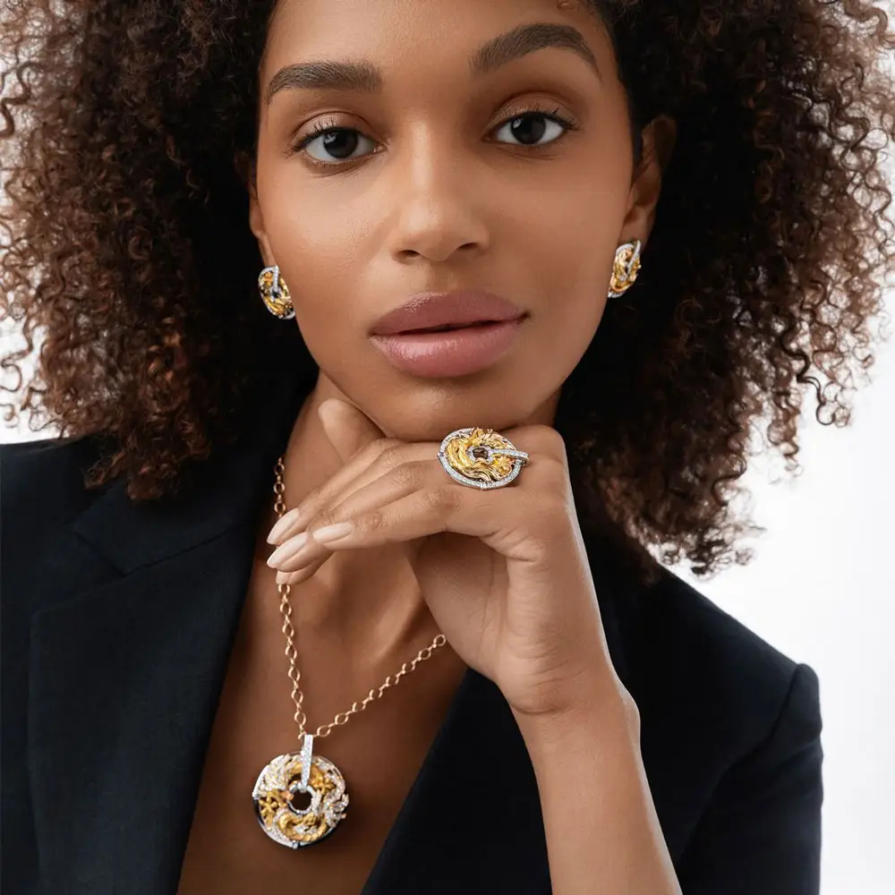 Carrera y Carrera New Shanghai Maxi Pavé là một chiếc vòng cổ đặc biệt kết hợp nghệ thuật trang sức Tây Ban Nha với sức mạnh huyền bí của biểu tượng phương Đông. Họa tiết rồng chủ đạo được chế tác từ vàng 18K vàng và trắng, đính 168 viên kim cương pavévới tổng trọng lượng 1.76 carat. Điểm nhấn độc đáo là viên kim cương xanh nặng 0.03 carat, tạo thành đôi mắt rồng, tăng thêm sự sâu lắng và cuốn hút cho tác phẩm.
