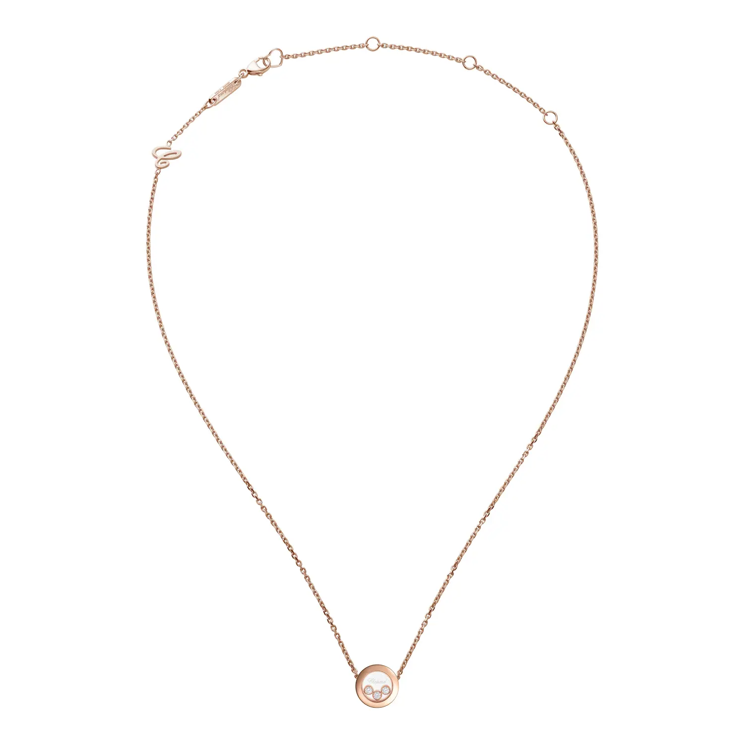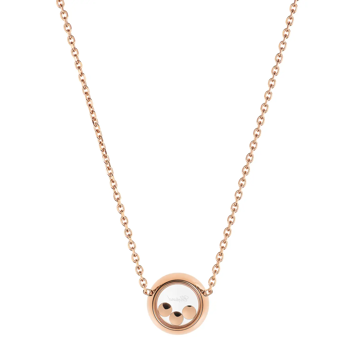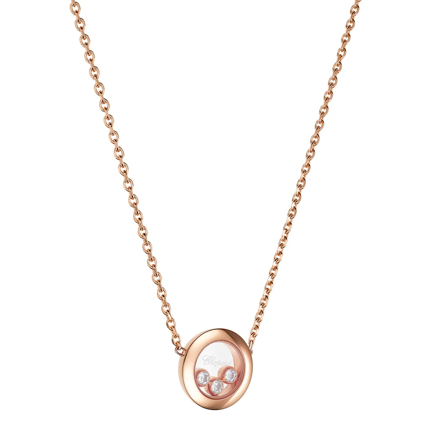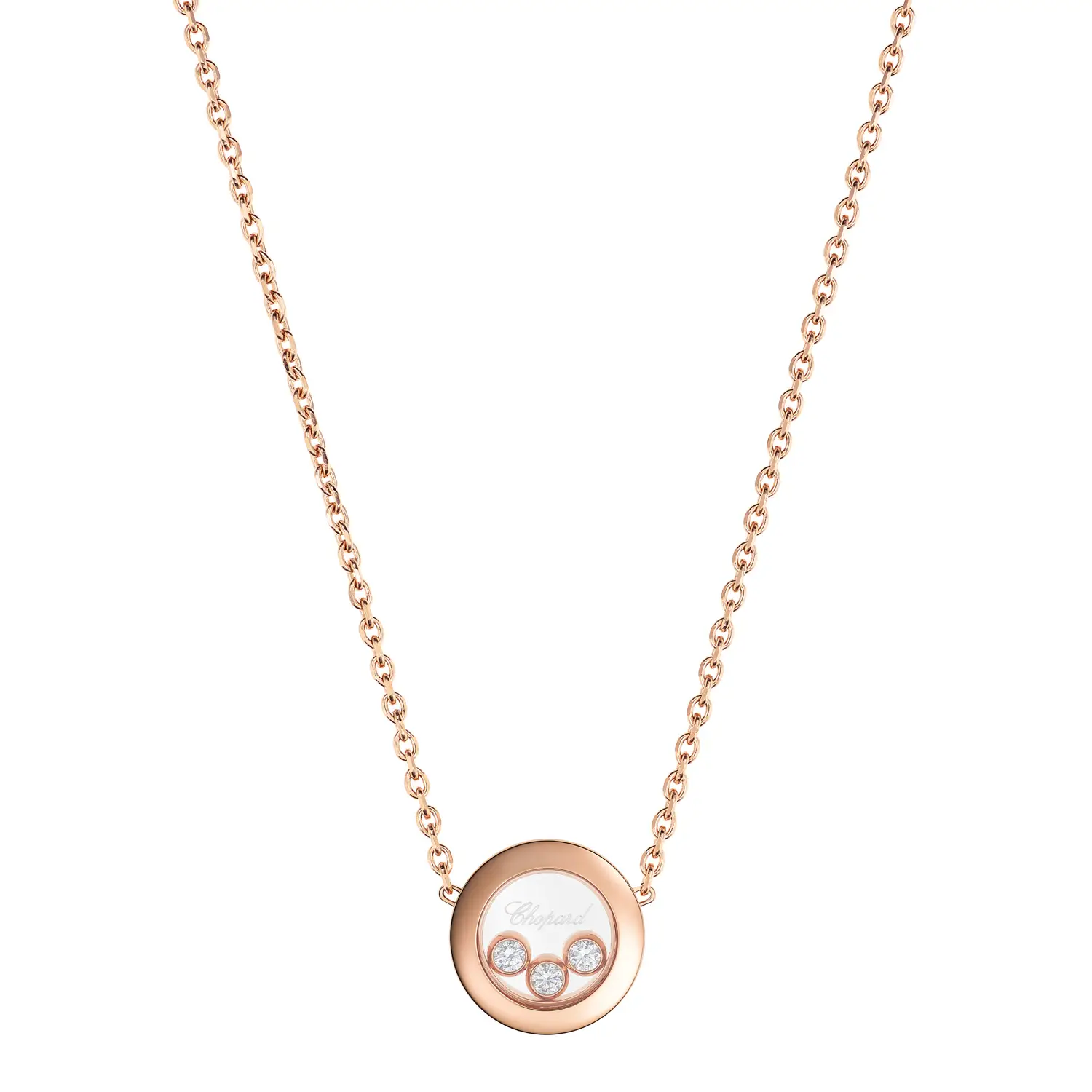 Dây chuyền Chopard Happy Diamonds Icons 81A018-5001 thể hiện sự thanh lịch, vui tươi và nét sang trọng vượt thời gian. Được chế tác từ vàng hồng 18 cara có nguồn gốc đạo đức, mặt dây hình tròn chứa ba viên kim cương tự do chuyển động (tổng trọng lượng 0,15 cara) giữa hai lớp kính sapphire – hiệu ứng “dancing diamonds” đặc trưng, tượng trưng cho tự do và niềm vui sống.