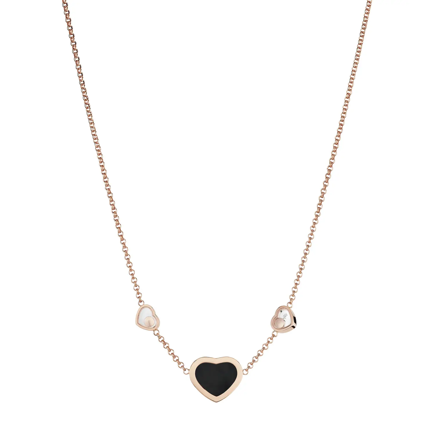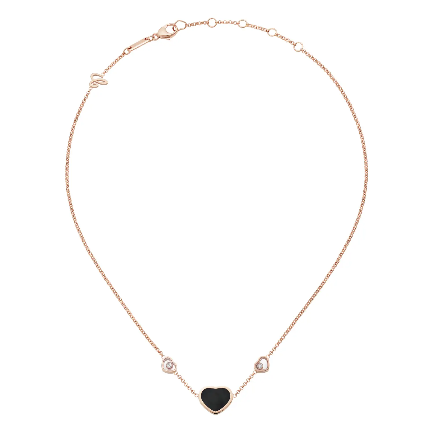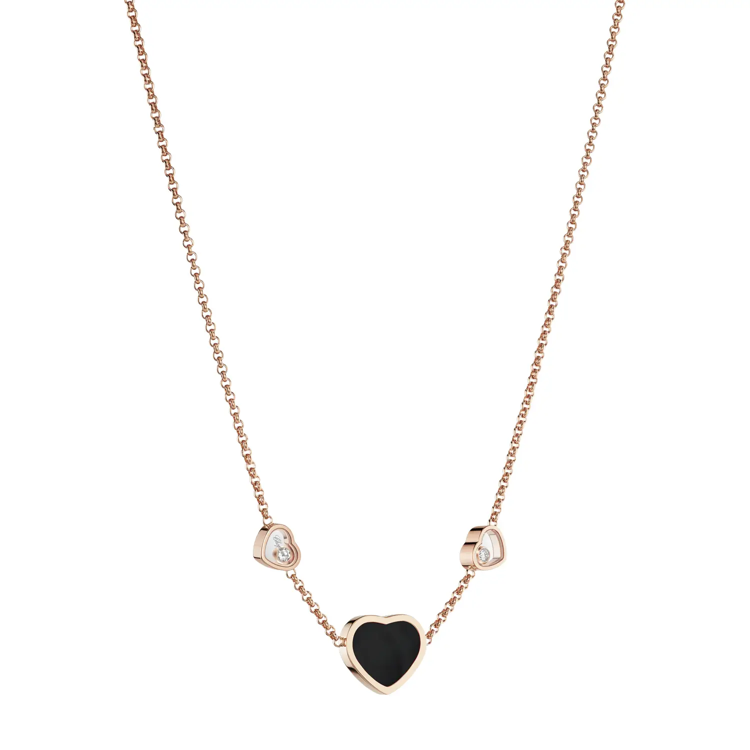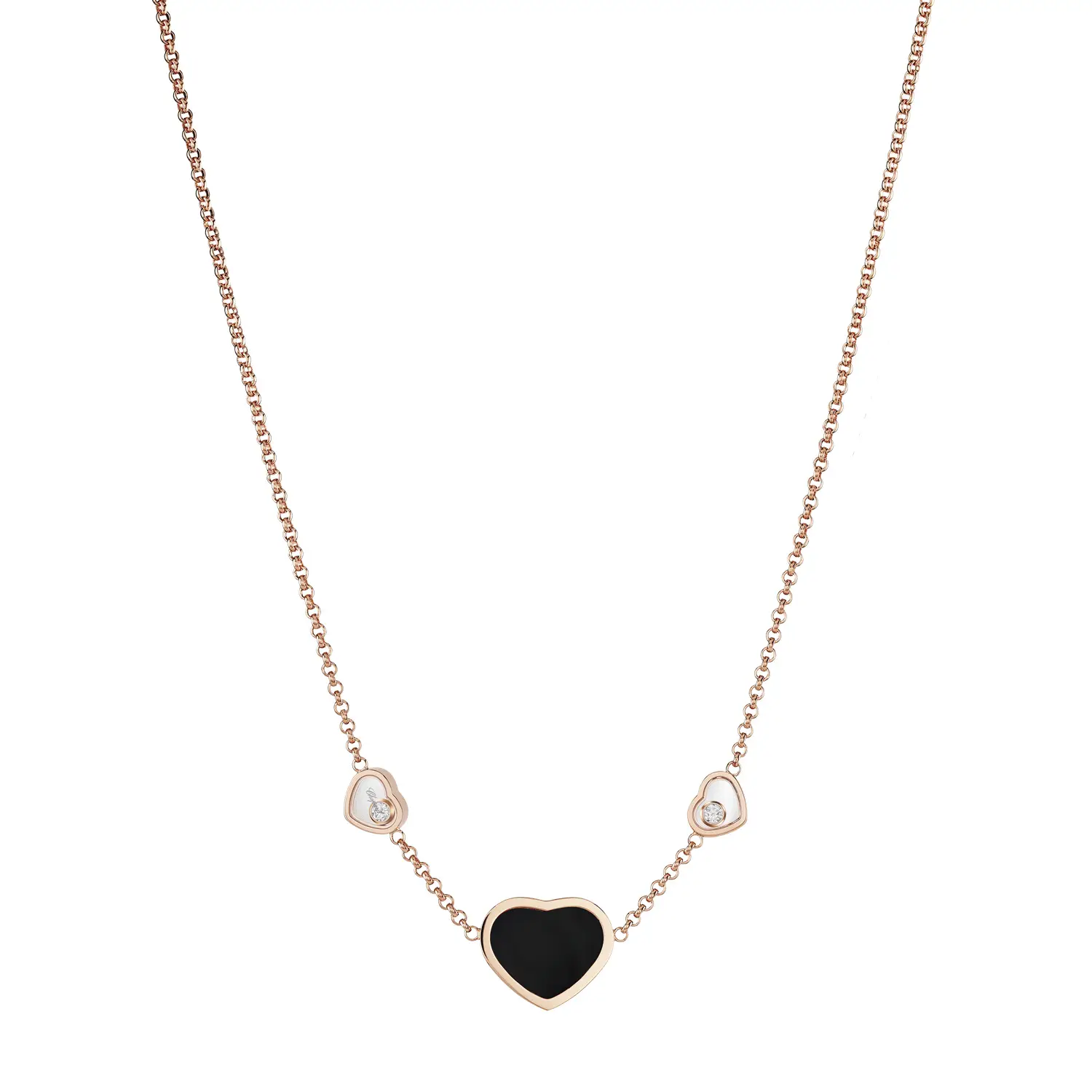 Chiếc dây chuyền thanh lịch này thuộc bộ sưu tập Happy Hearts, thể hiện sự hòa quyện giữa tình yêu và nét xa hoa hiện đại. Được chế tác từ vàng hồng 18 k, mặt dây hình trái tim bằng đá mã não đen điểm xuyết hai viên kim cương tổng trọng lượng khoảng 0,11 ct, tạo nên sự cân bằng hoàn hảo giữa sức mạnh và sự dịu dàng. Sắc đen sâu thẳm hòa cùng ánh vàng ấm áp mang lại vẻ đẹp sang trọng vượt thời gian.
