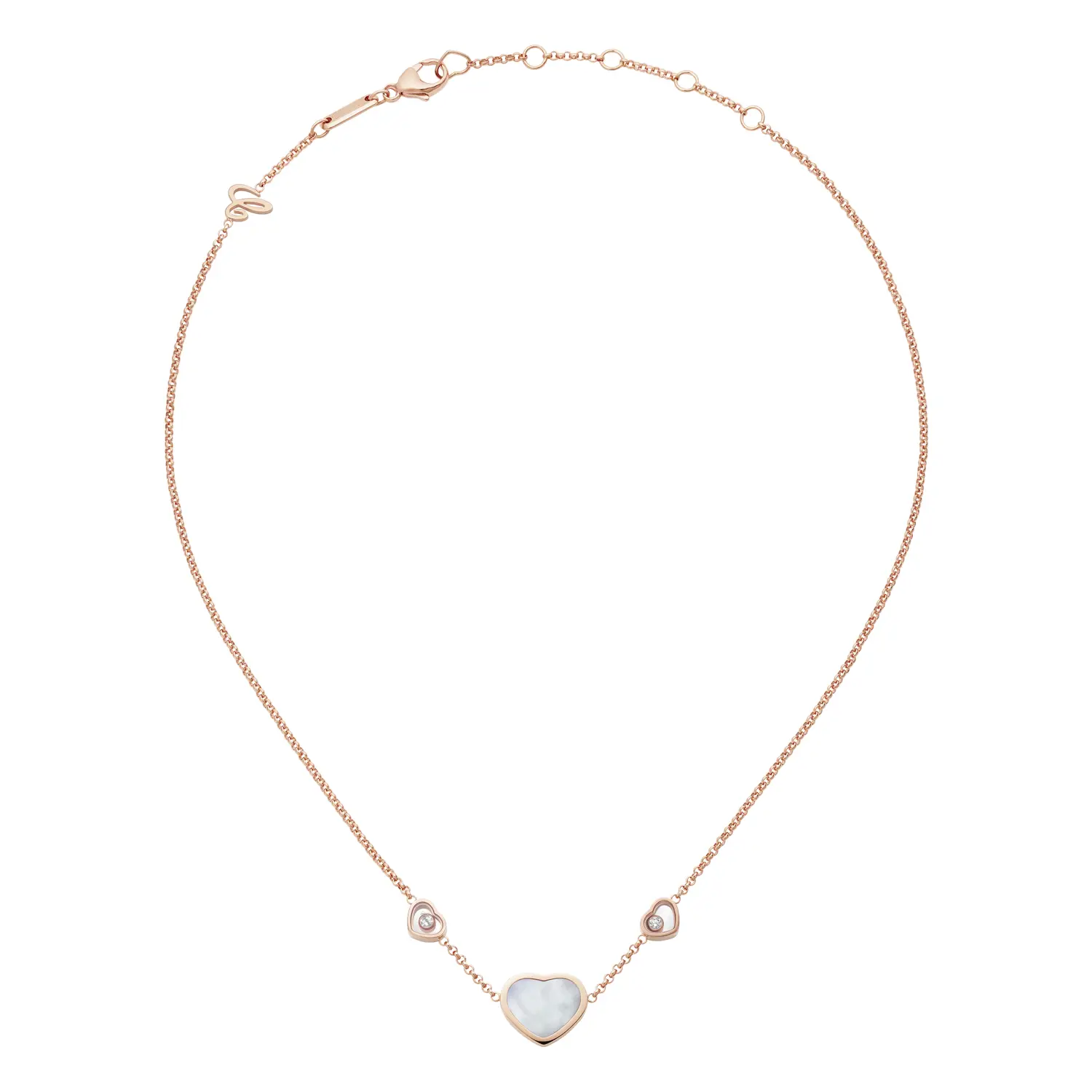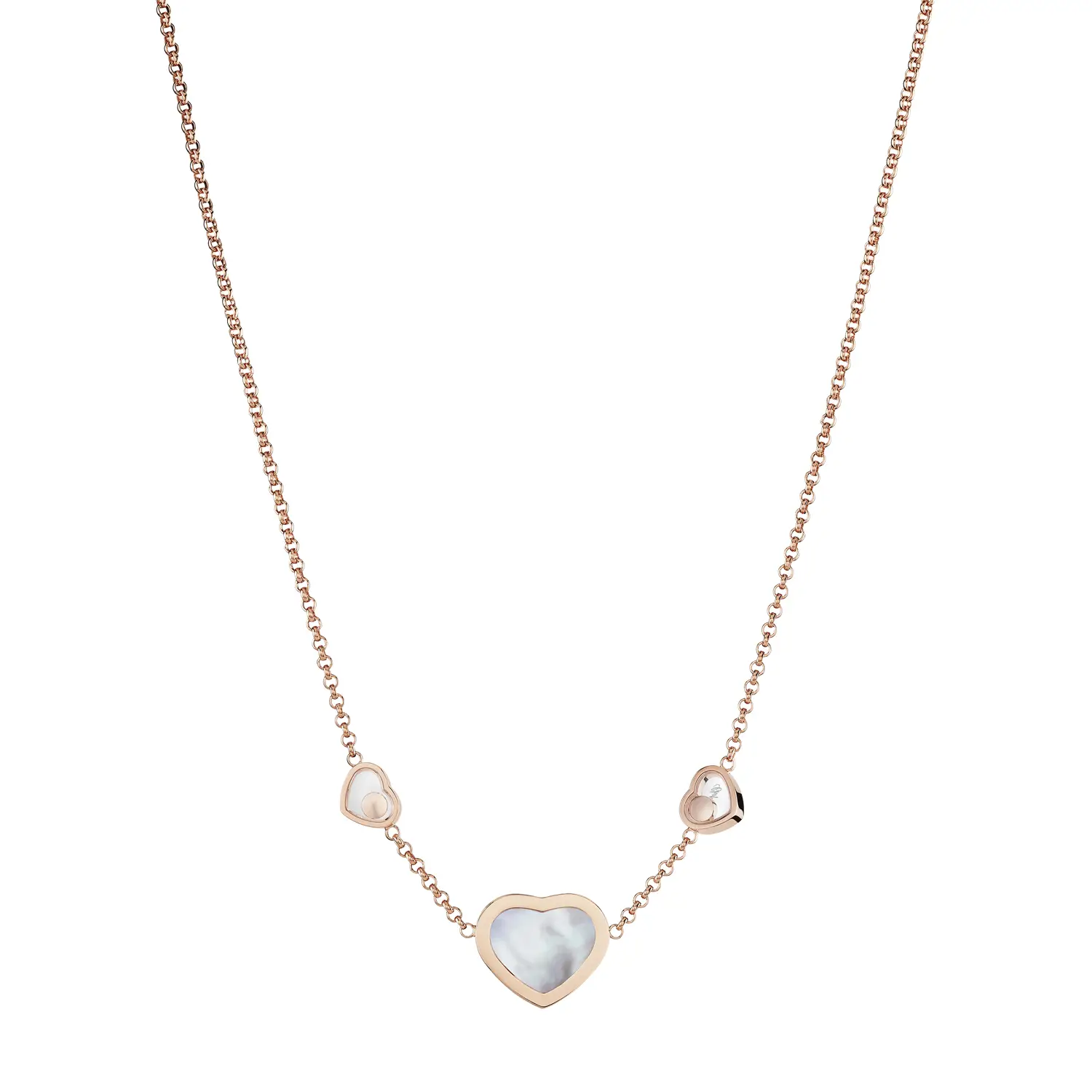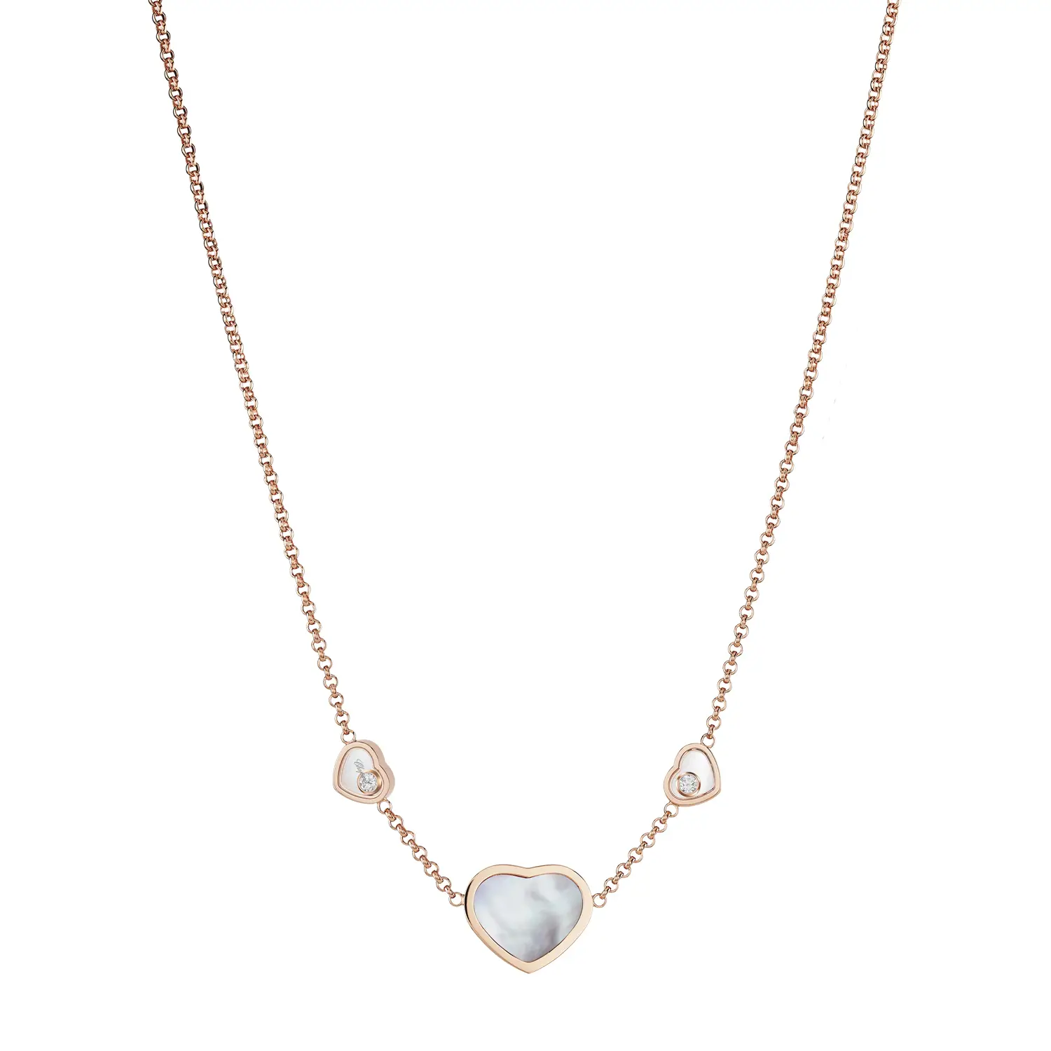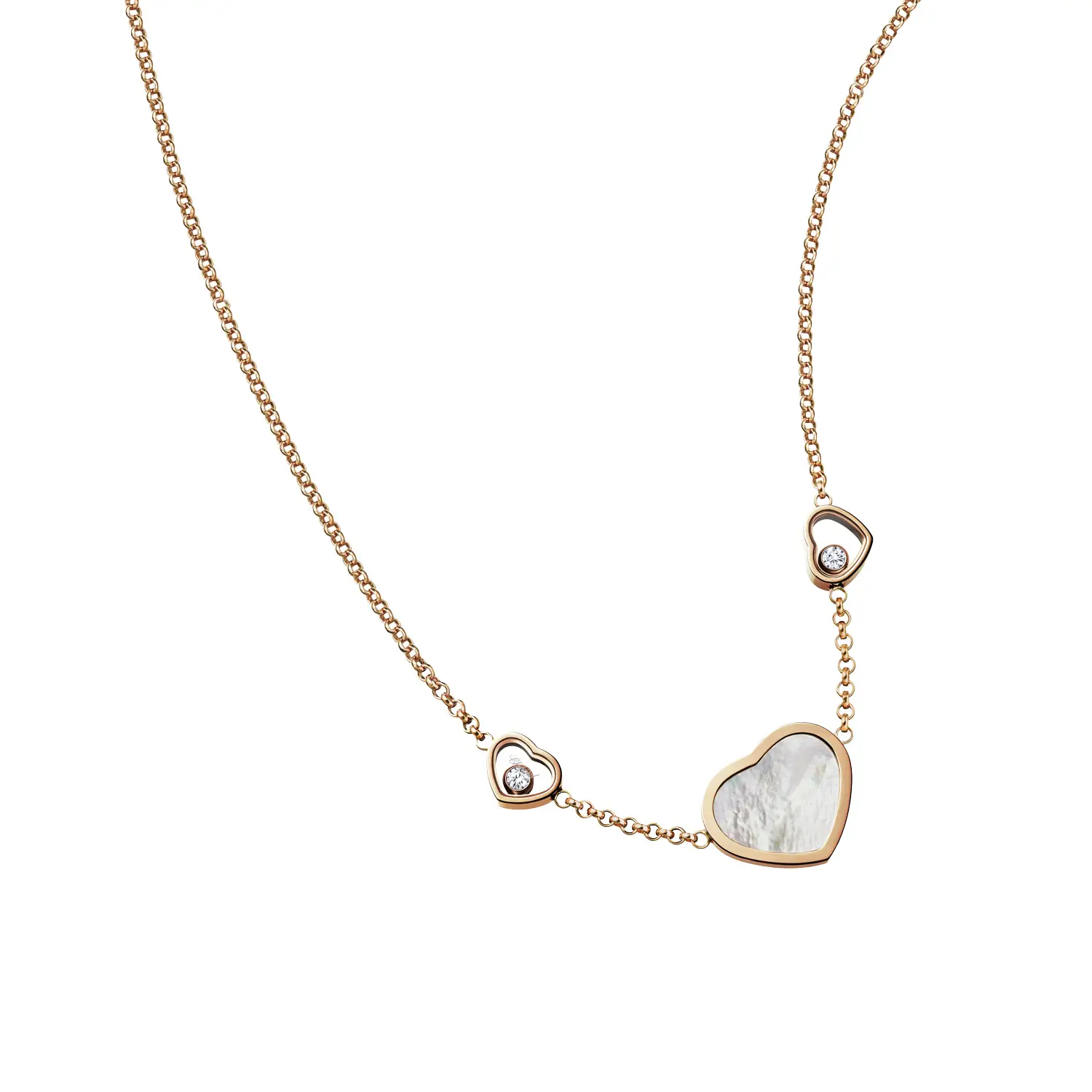 Chiếc dây chuyền thanh lịch này thuộc bộ sưu tập Happy Hearts, thể hiện niềm vui, sự dịu dàng và nét duyên dáng nữ tính – tinh thần đặc trưng của Chopard. Được chế tác từ vàng hồng 18 k, trang trí bằng họa tiết trái tim từ xà cừ tự nhiên và điểm xuyết viên kim cương lấp lánh, món trang sức truyền tải triết lý của thương hiệu: “Những viên kim cương nhỏ có thể tạo nên điều vĩ đại.” Sự kết hợp giữa sắc ấm của vàng và ánh sáng mềm mại của xà cừ mang lại vẻ đẹp tinh tế và sang trọng.