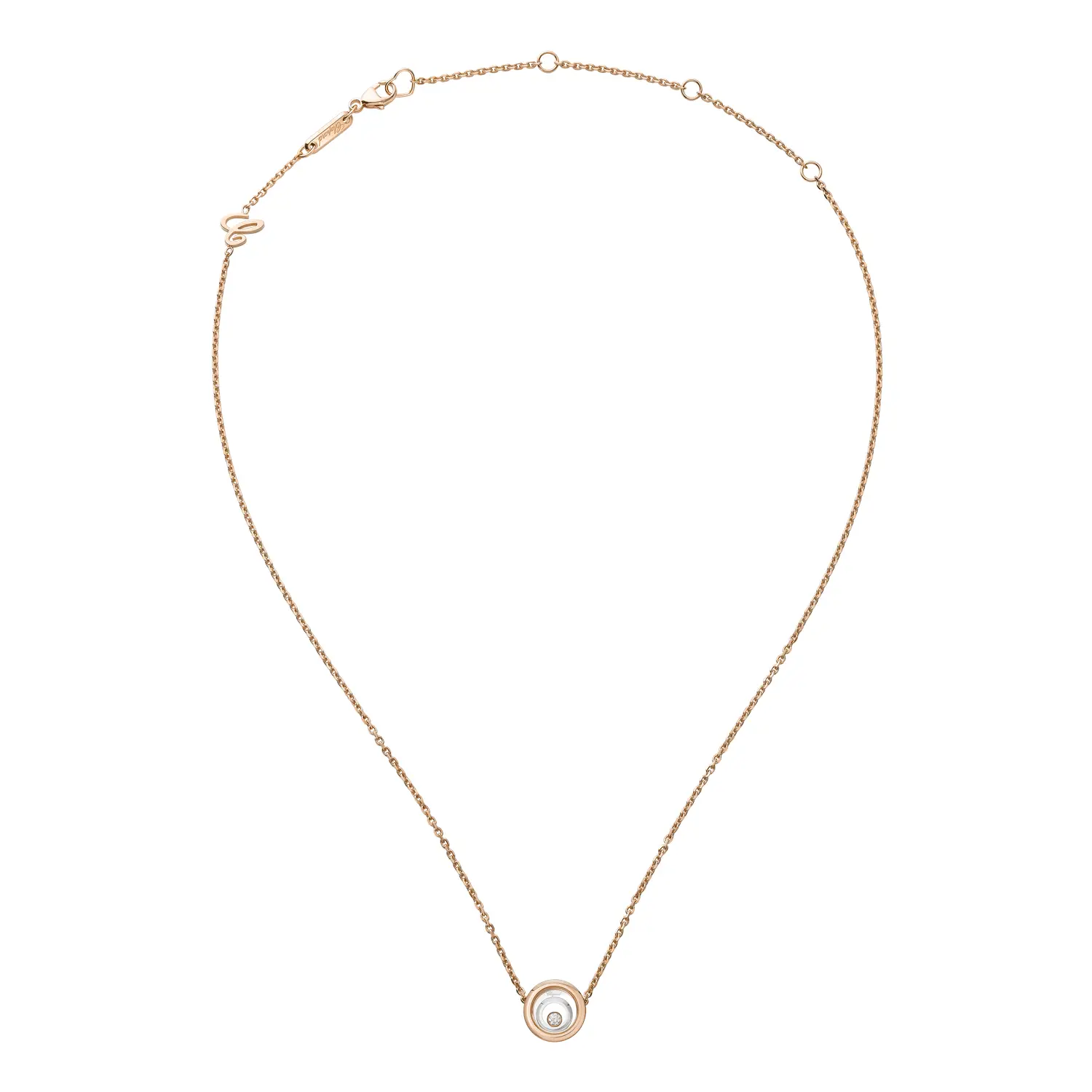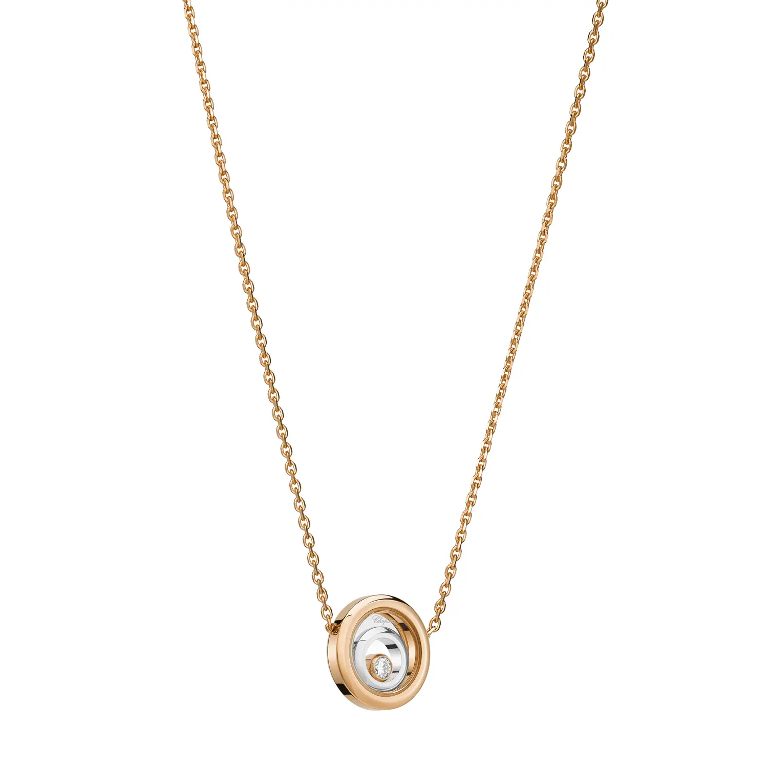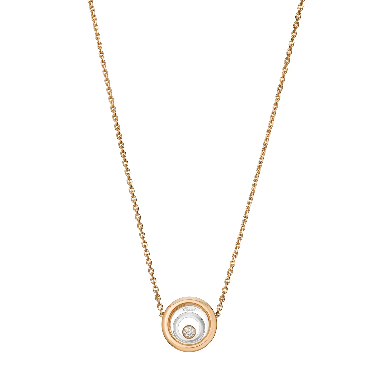 Chiếc dây chuyền thanh lịch này thuộc bộ sưu tập Happy Spirit, kết hợp vẻ đẹp vượt thời gian của Chopard với nét duyên dáng và năng lượng tích cực của phái nữ. Được chế tác từ vàng hồng và vàng trắng 18 k, đính một viên kim cương chuyển động tự do khoảng 0,09 ct, mỗi chuyển động đều tạo nên điệu vũ ánh sáng tinh tế. Thiết kế vòng tròn đồng tâm tượng trưng cho sự hài hòa, cân bằng và nhịp sống vô tận.