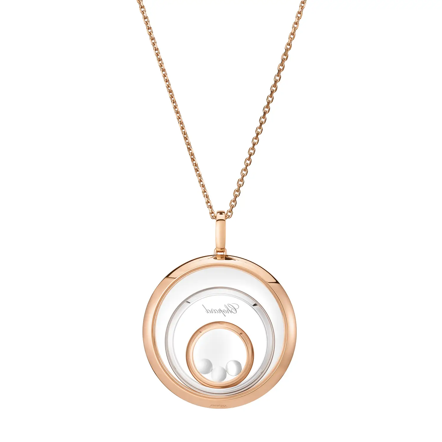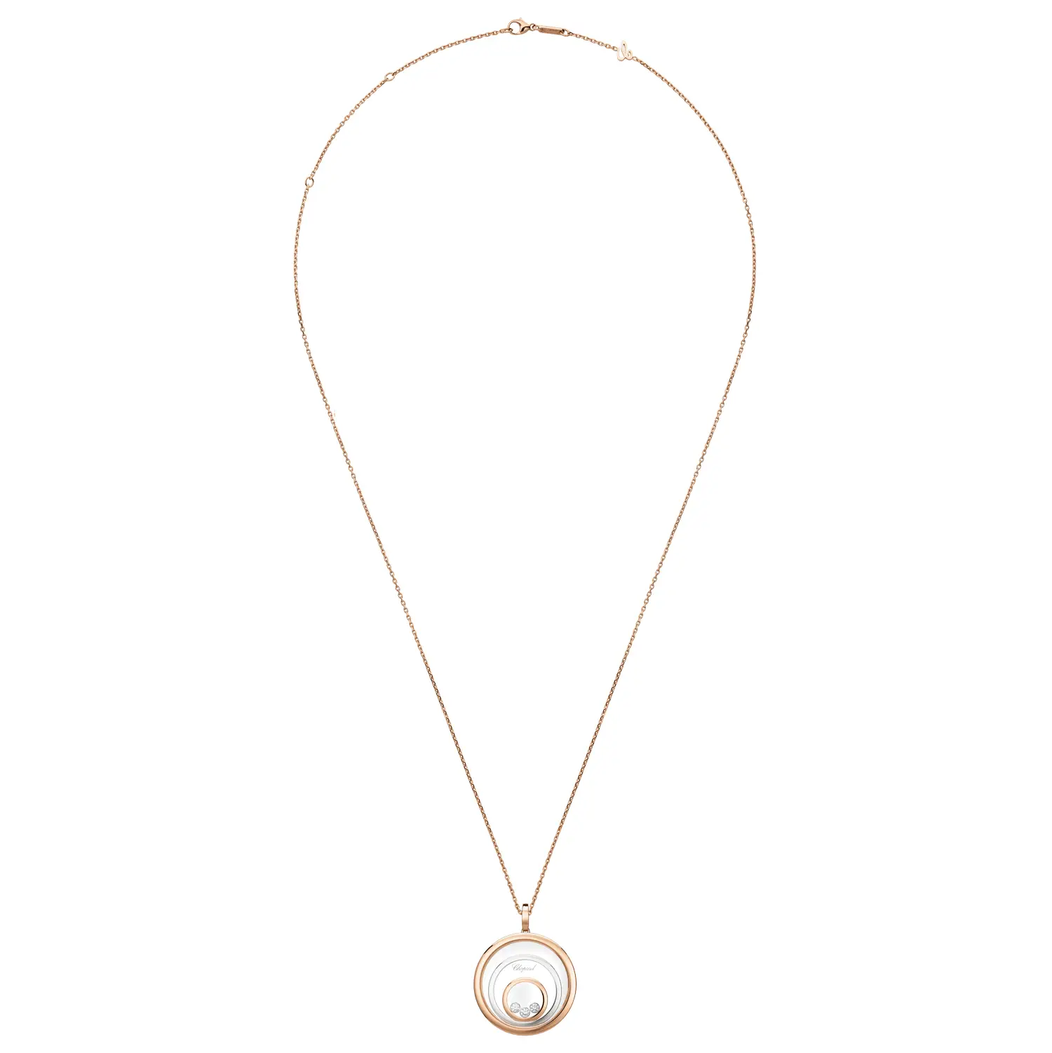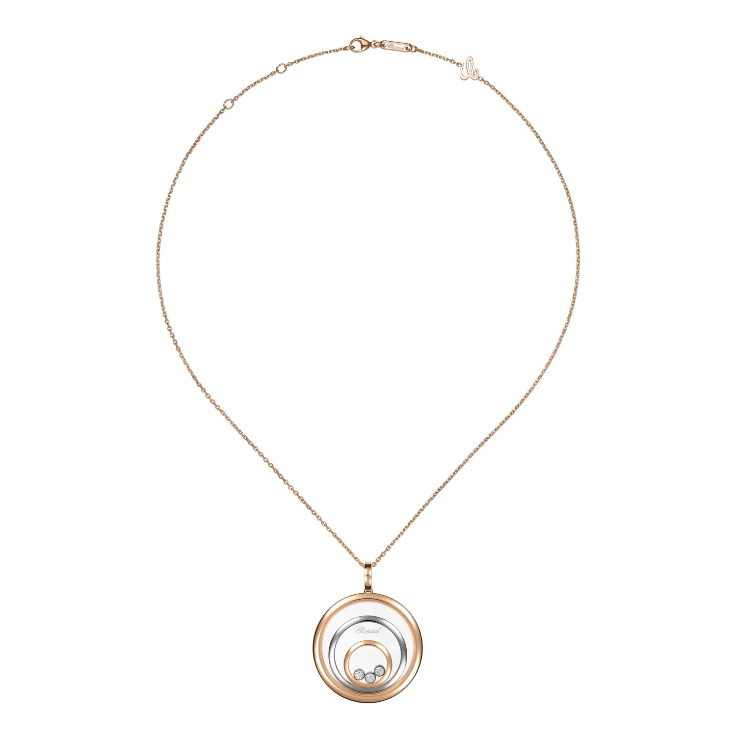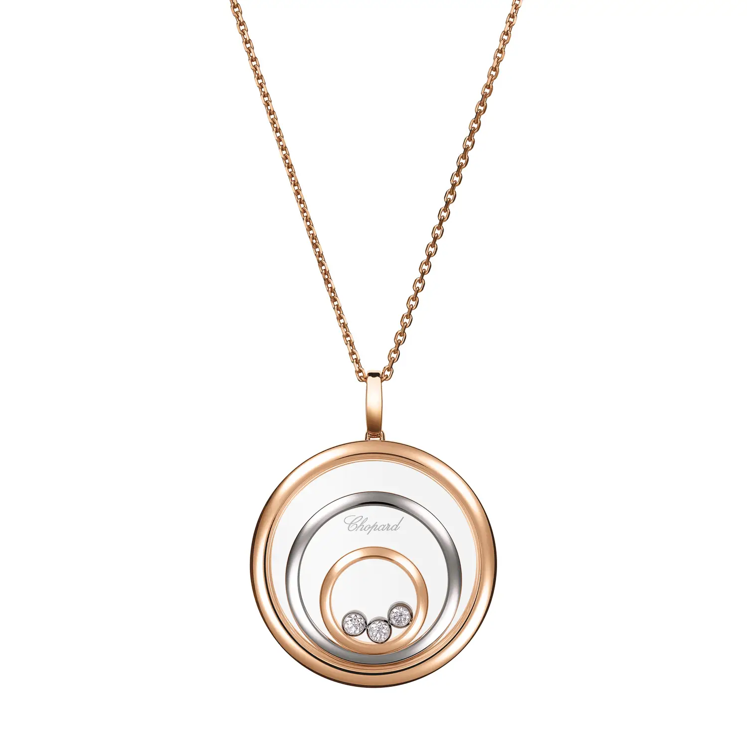 Mặt dây chuyền Chopard Happy Spirit 798232-9001 tôn vinh sự hài hòa, ánh sáng và vẻ đẹp nữ tính. Được chế tác từ vàng hồng và vàng trắng 18 cara có nguồn gốc đạo đức, sản phẩm kết hợp sắc ấm và lạnh tạo nên nét thanh lịch vượt thời gian. Ở trung tâm, viên kim cương tự do chuyển động giữa hai lớp kính sapphire, được bao quanh bởi các vòng tròn đồng tâm đính kim cương tổng trọng lượng 0,28 cara – hiệu ứng “dancing diamond” đặc trưng, biểu tượng của tự do và niềm vui sống.