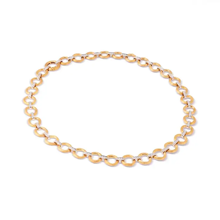 Dây chuyền Marco Bicego Jaipur Diamond CB2660-B YW thể hiện sự kết hợp hoàn hảo giữa vẻ đẹp cổ điển và tinh tế hiện đại. Được chế tác từ vàng vàng 18k (750/1000) với lớp hoàn thiện mờ, chiếc vòng mang đến vẻ đẹp mềm mại và sang trọng tự nhiên. Chiều dài 45 cm giúp ôm nhẹ quanh cổ, tạo cảm giác thanh thoát và cân đối.