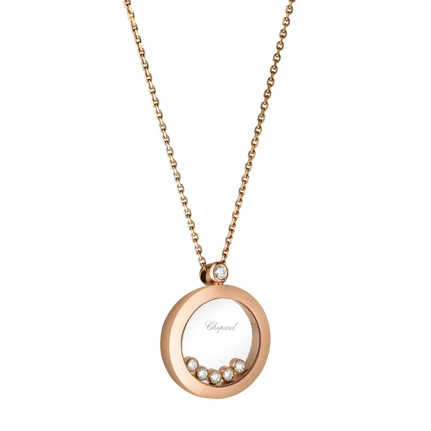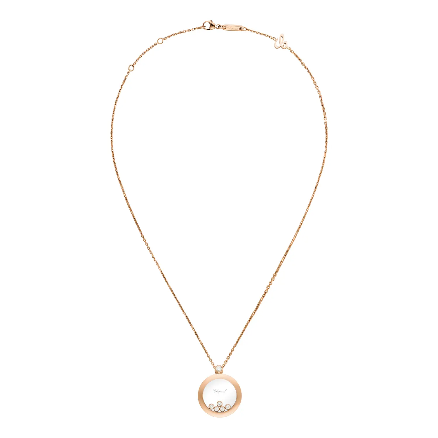 Dây chuyền Chopard Happy Diamonds Icons 799434-5001 thể hiện vẻ đẹp thanh lịch và niềm vui sống của người phụ nữ. Được chế tác từ vàng hồng 18 cara có nguồn gốc đạo đức, mặt dây chuyền hình tròn chứa ba viên kim cương tự do chuyển động (tổng trọng lượng 0,35 cara) giữa hai lớp kính sapphire – biểu tượng cho sự tự do và hạnh phúc trong bộ sưu tập Happy Diamonds.