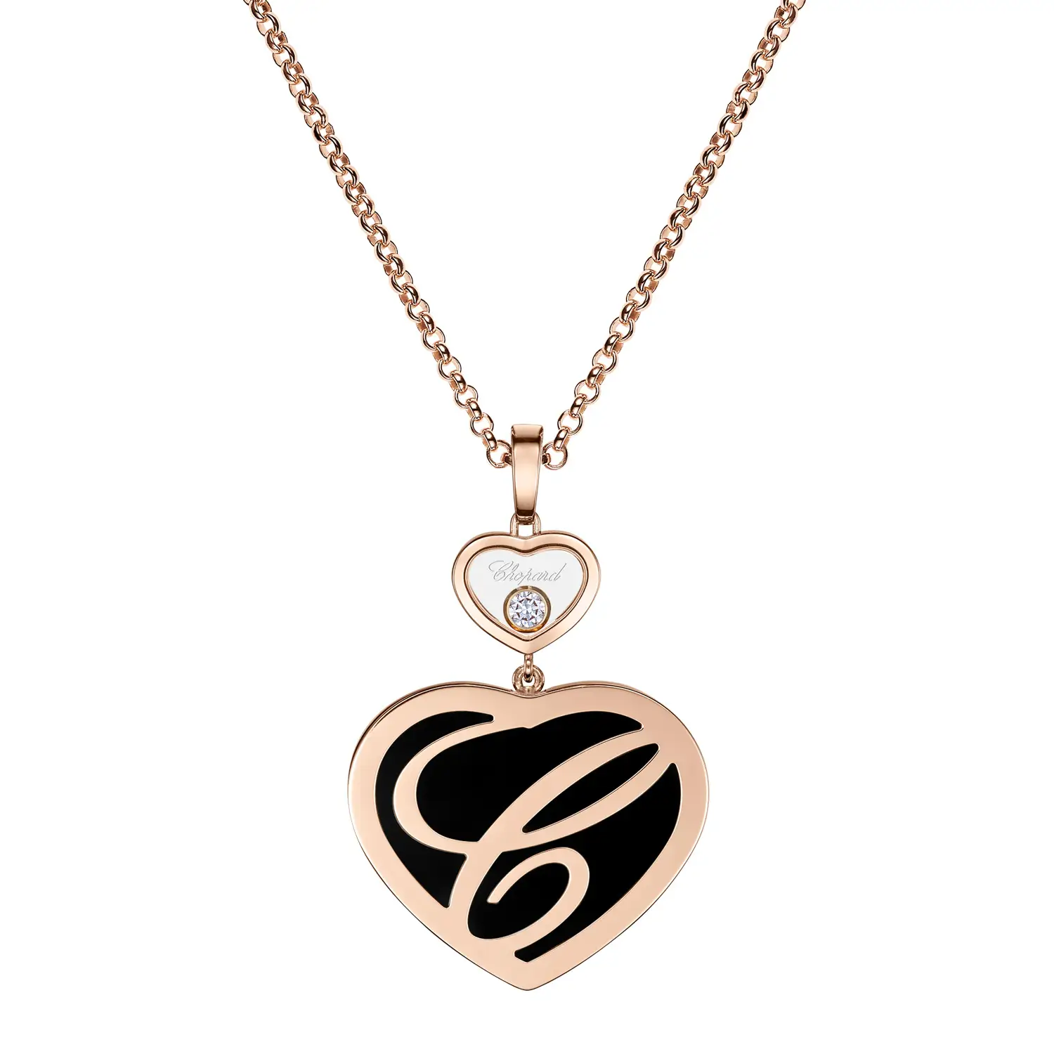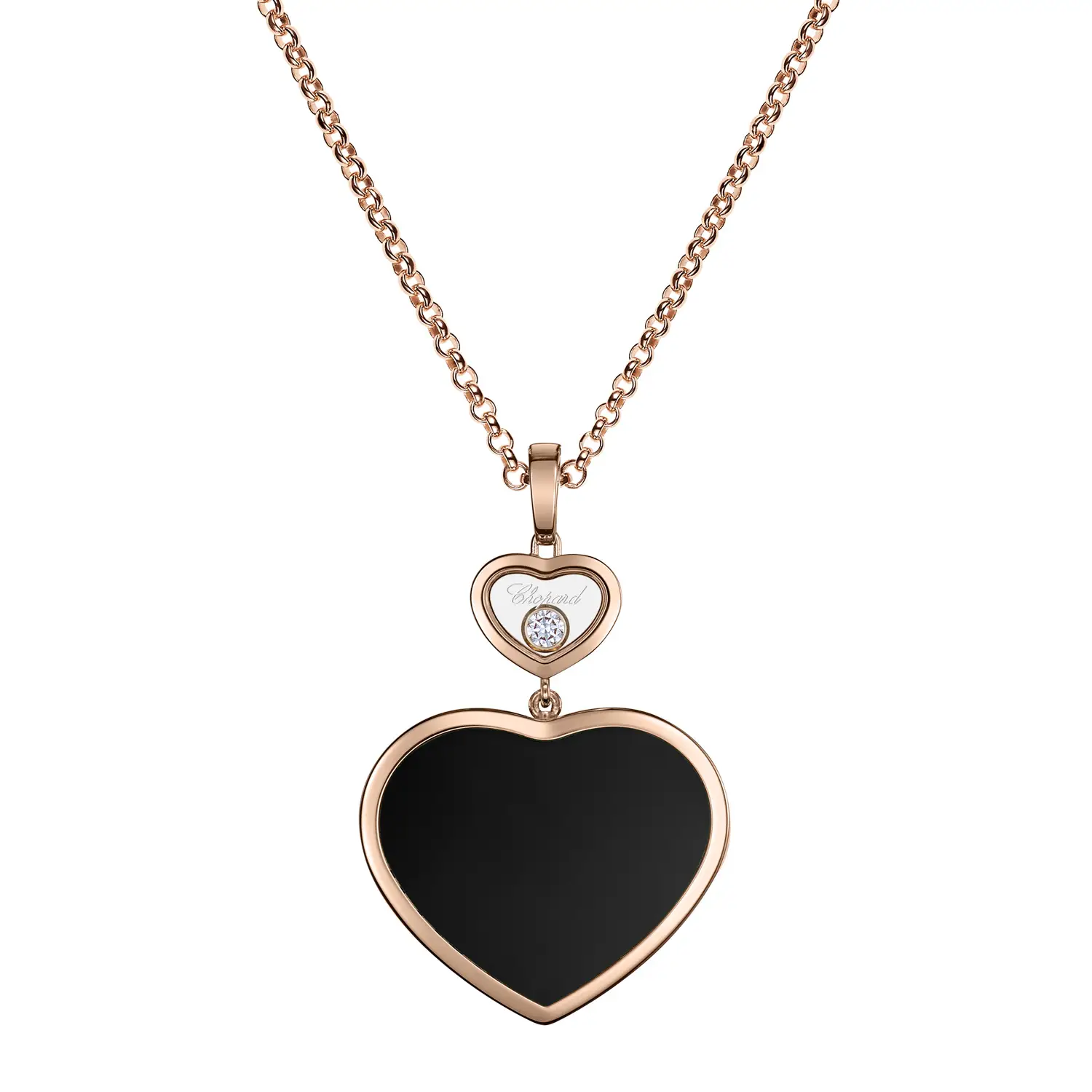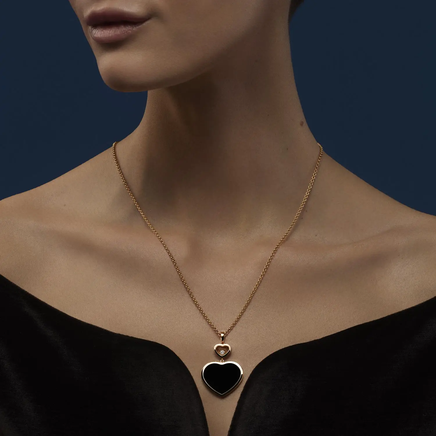 Một nửa mặt dây là viên onyx tự nhiên hình trái tim với sắc đen sâu thẳm tạo nên sự tương phản thanh lịch với sắc ấm của vàng hồng. Nửa còn lại được điểm xuyết bởi một viên kim cương chuyển động tự do trong một trái tim nhỏ hơn. Viên kim cương tròn tự nhiên này có độ tinh khiết IF và màu sắc F-G, mang lại độ sáng và lấp lánh tuyệt vời.