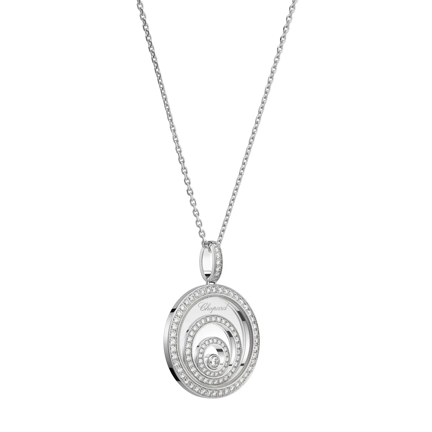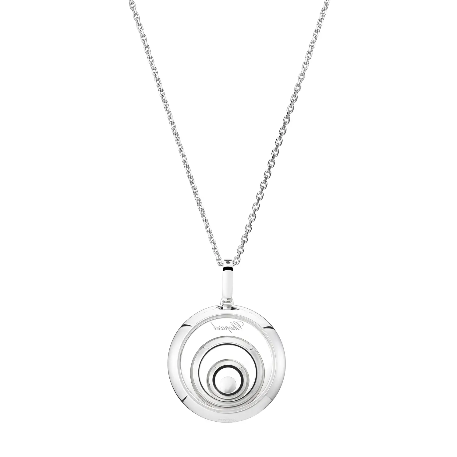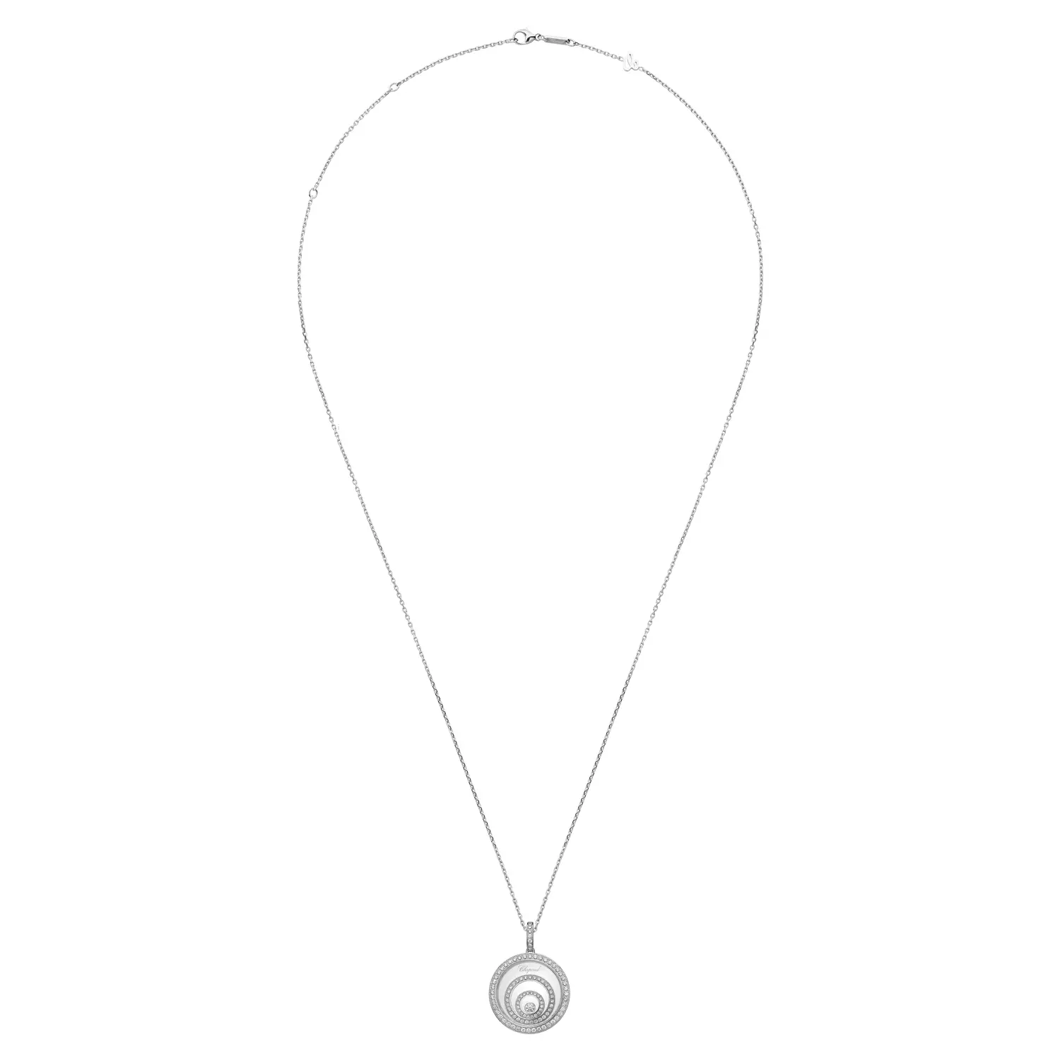 Mặt dây chuyền Chopard Happy Spirit 798231-1001 thể hiện sự hài hòa giữa chuyển động, ánh sáng và vẻ đẹp tinh tế. Được chế tác từ vàng trắng 18 cara có nguồn gốc đạo đức, thiết kế gồm ba vòng tròn đồng tâm đính kim cương tổng trọng lượng 0,91 cara tỏa sáng theo từng cử động. Ở trung tâm là viên kim cương tự do chuyển động giữa hai lớp kính sapphire – hiệu ứng “dancing diamond” biểu trưng cho tự do và niềm vui sống.