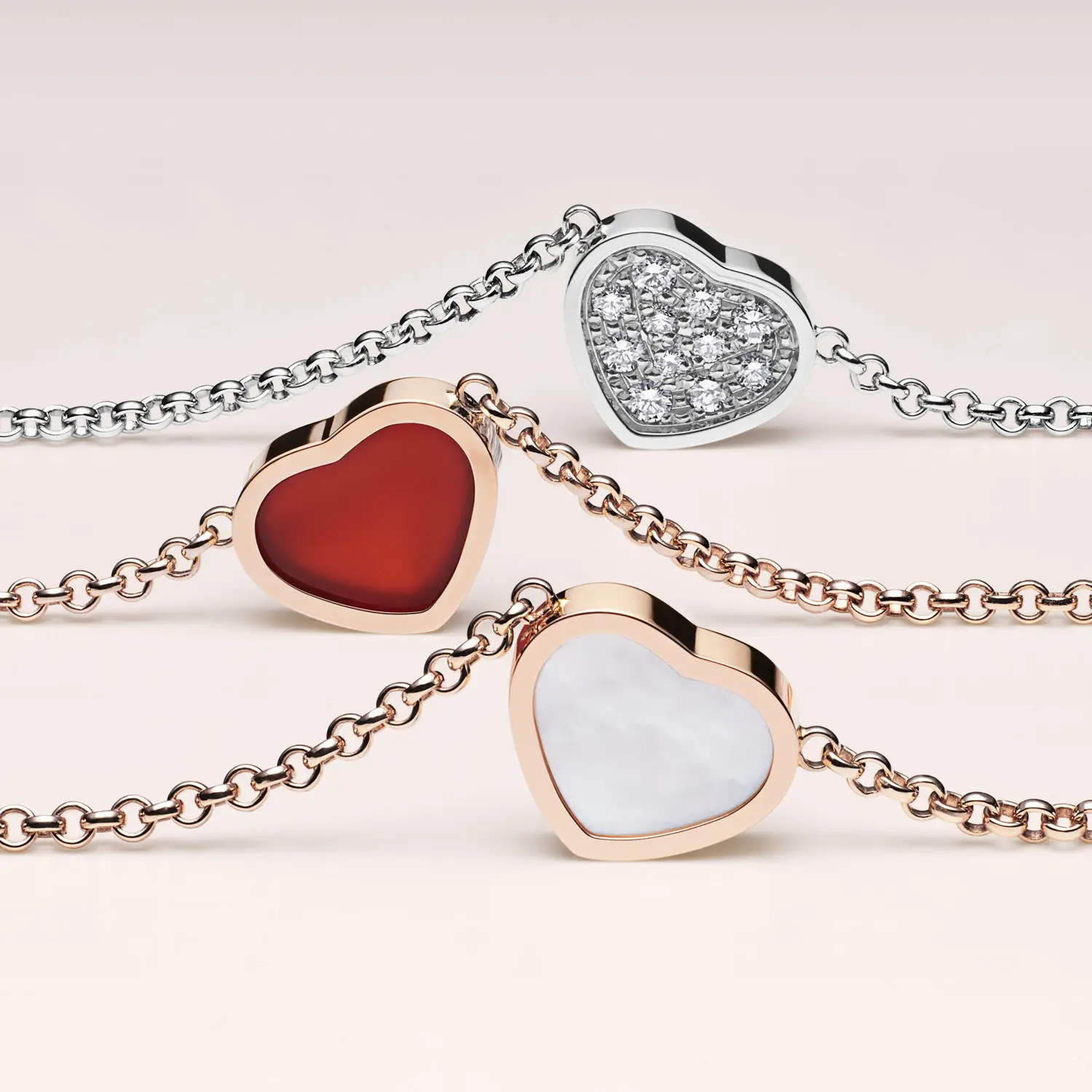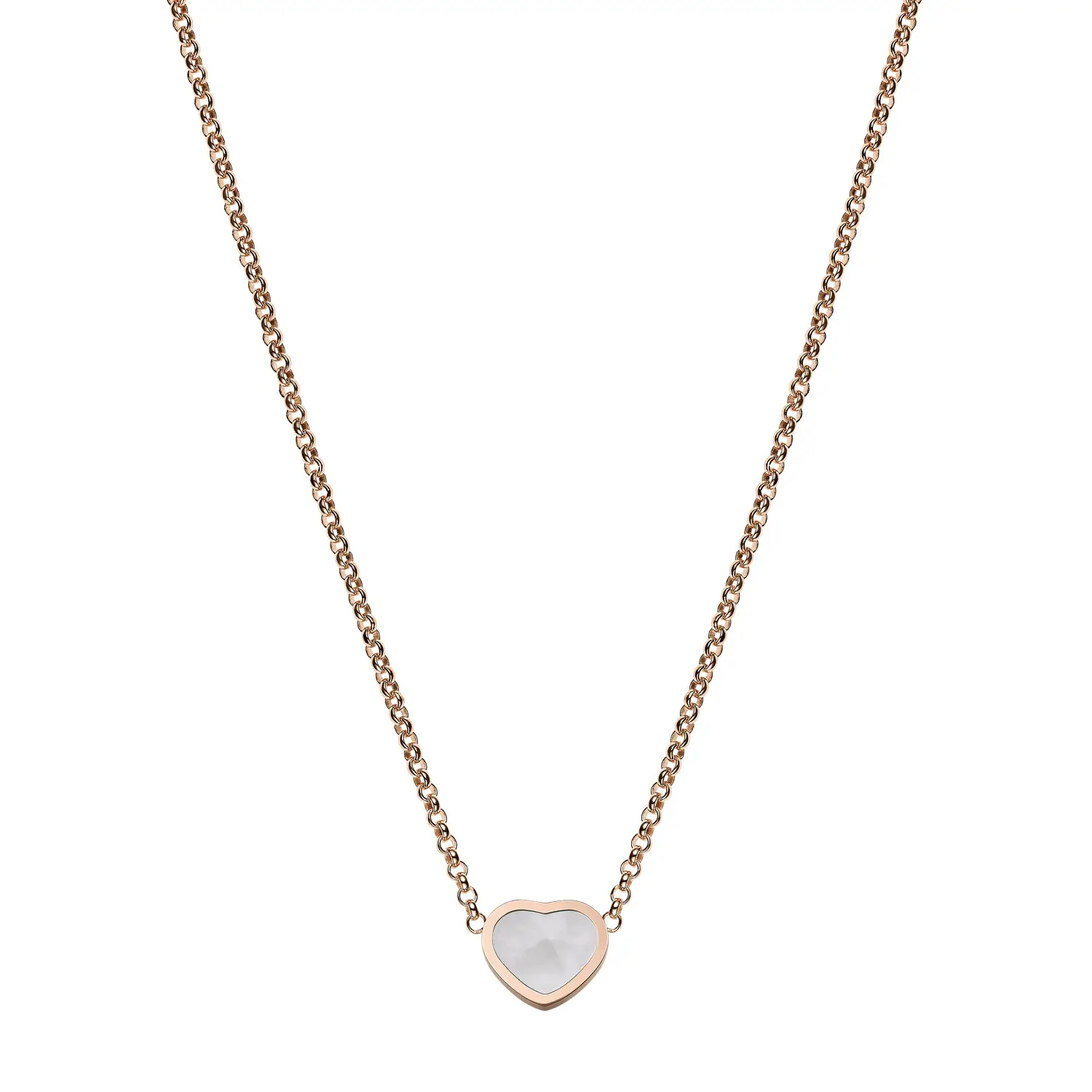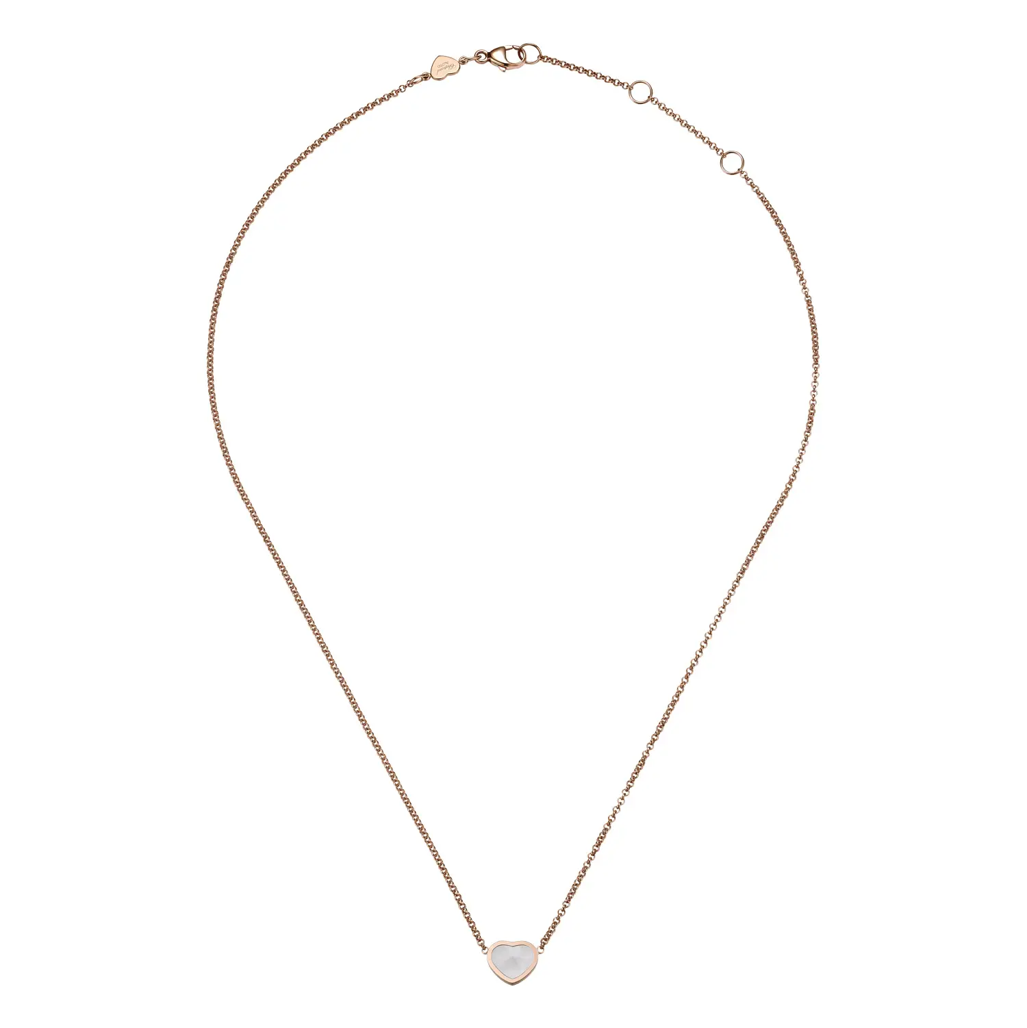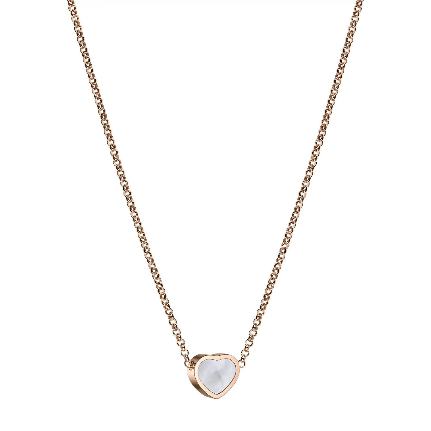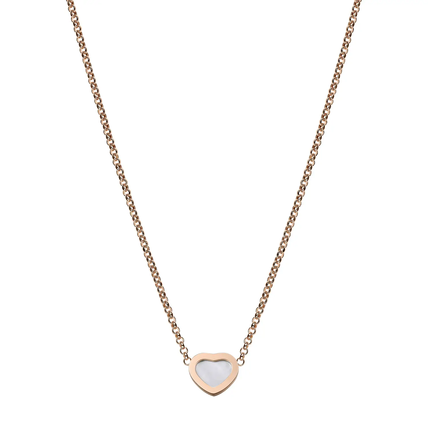 Dây chuyền Chopard My Happy Hearts 81A086-5301 thể hiện vẻ đẹp nữ tính, tinh tế và hiện đại. Được chế tác từ vàng hồng 18 cara có nguồn gốc đạo đức, dây chuyền được trang trí bằng trái tim xà cừ trắng tỏa sáng nhẹ nhàng dưới ánh sáng.