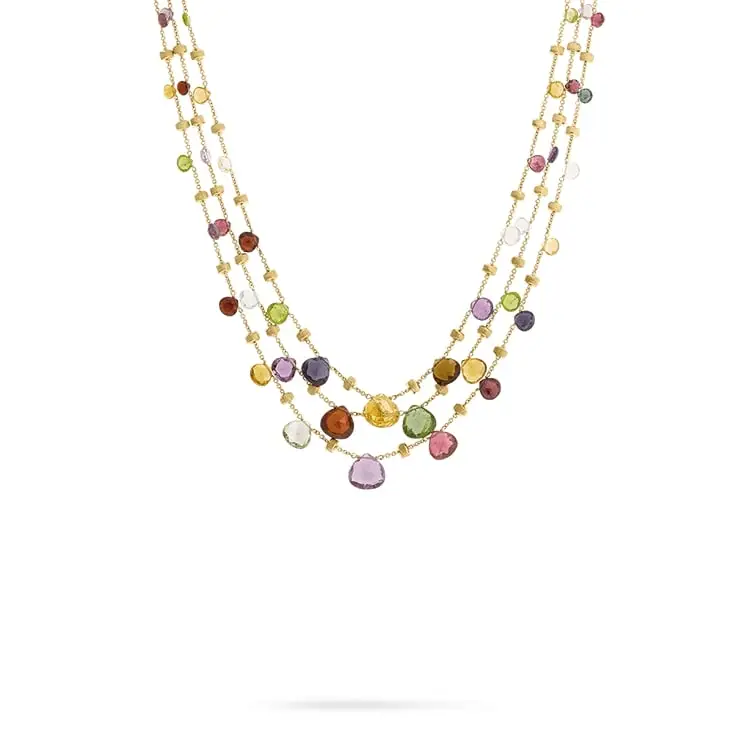 Vòng cổ Marco Bicego Paradise là sự tôn vinh cho cuộc sống đầy màu sắc và vẻ đẹp, được chế tác từ vàng vàng 18 k (750/1000) cao cấp. Chiều dài dây là 46 cm, với phần bề mặt kết hợp giữa bóng và mờ, mang đến sự hài hòa giữa thanh lịch tinh tế và thiết kế sống động. Bộ sưu tập Paradise gộp những sợi dây vàng mảnh với bảng màu đa dạng của các viên đá bán quý tự nhiên – mỗi viên được cắt hình dáng 'pear' (hình giọt lê), tạo nên vẻ đẹp vừa tinh nghịch vừa sang trọng.