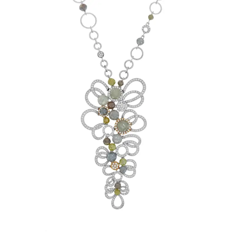 Chiếc dây chuyền vàng trắng đính đá quý màu và kim cương của Beny Jewellery là sự kết hợp hoàn hảo giữa sự sang trọng, tinh tế và tay nghề đỉnh cao. Được chế tác từ vàng trắng 18 kt (750/1000) với lớp đánh bóng sáng gương, thiết kế mang vẻ đẹp độc đáo và rực rỡ của màu sắc tự nhiên.