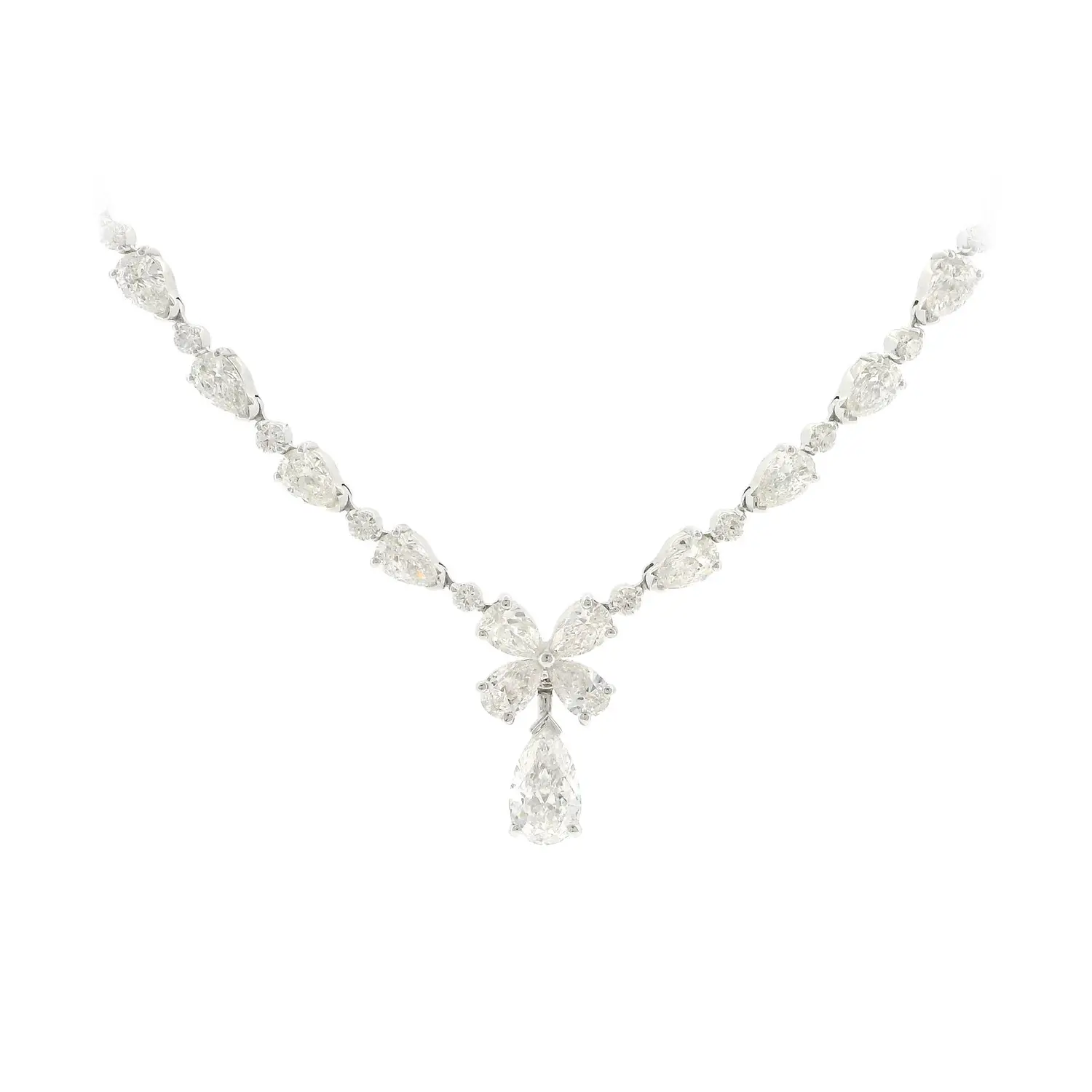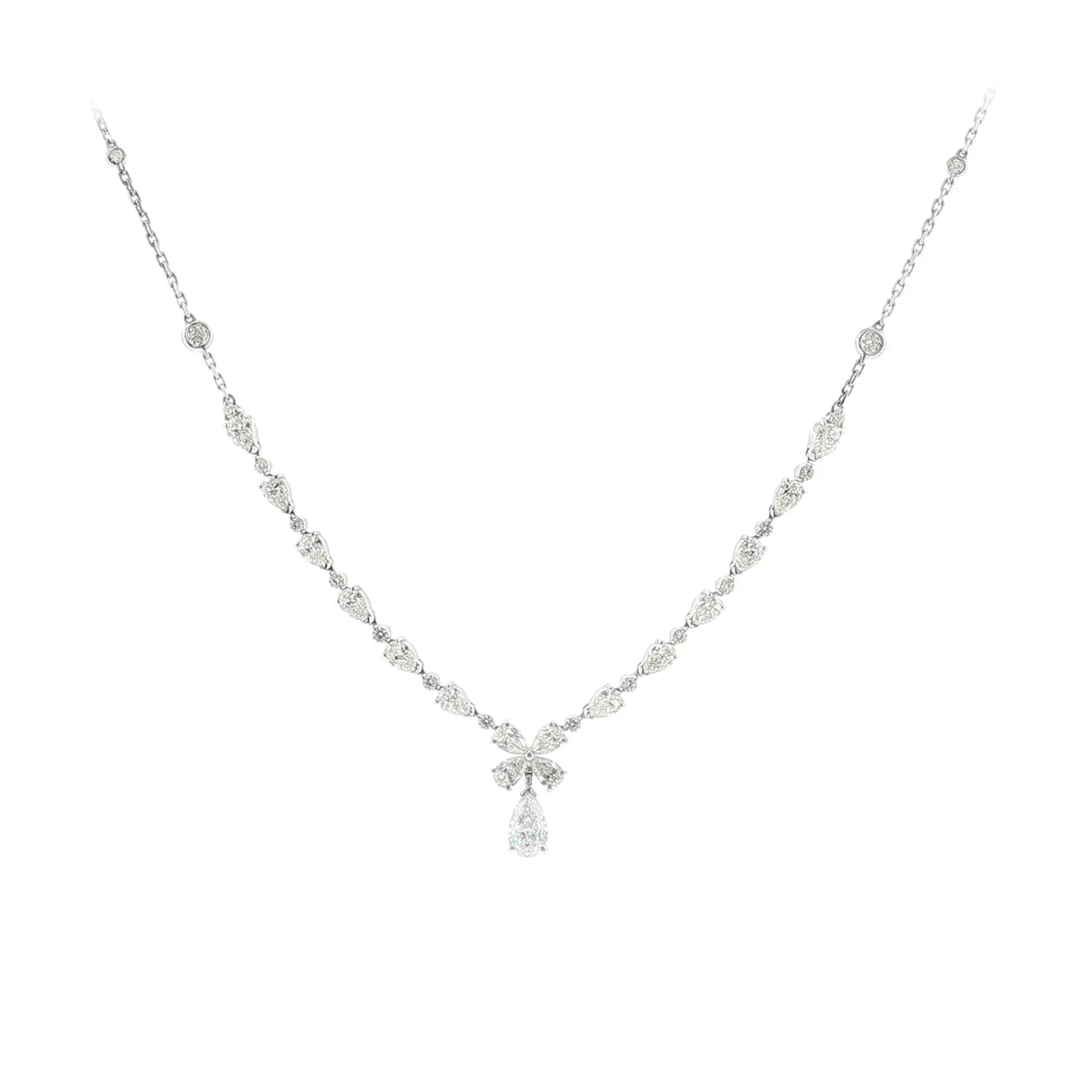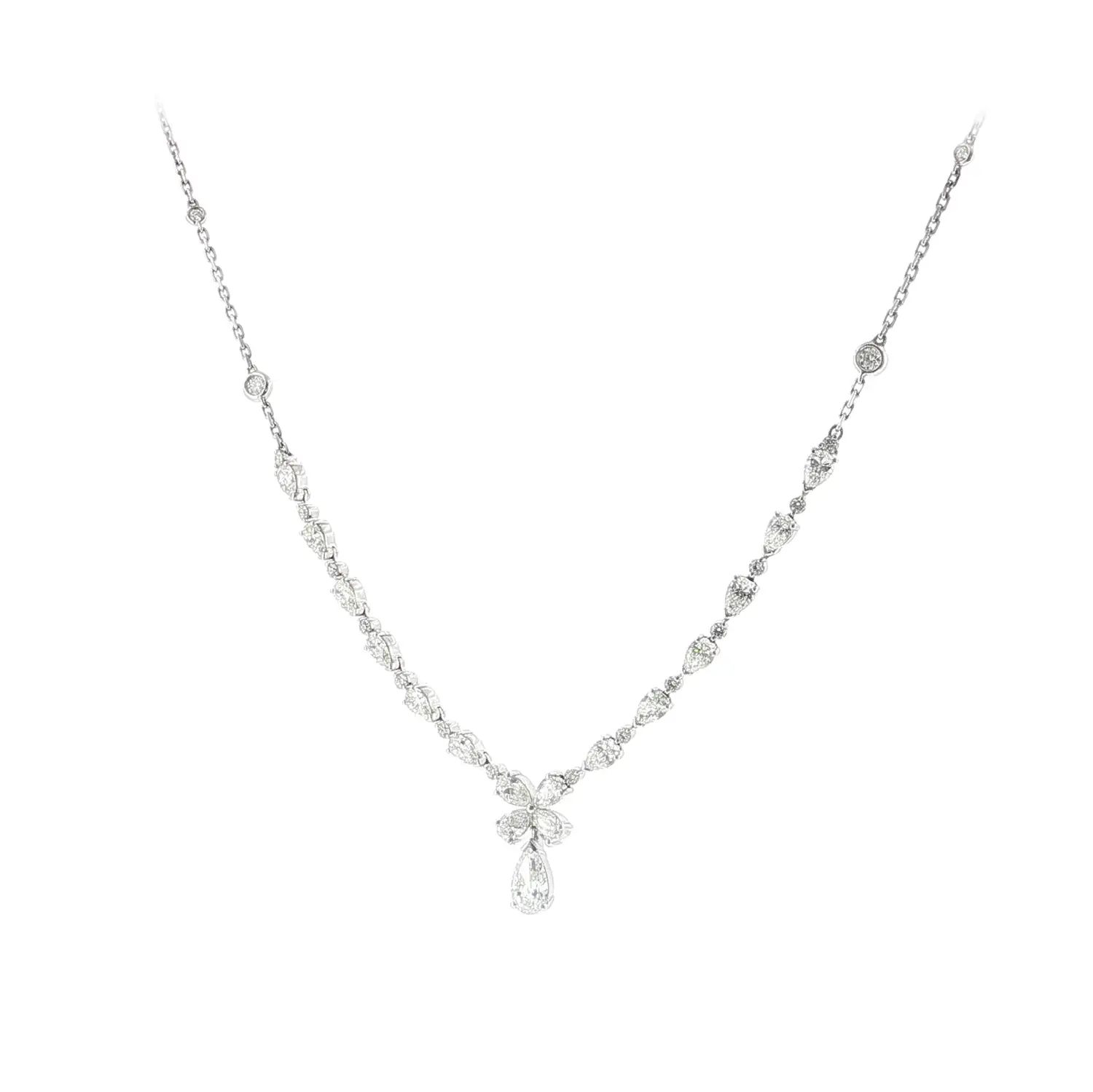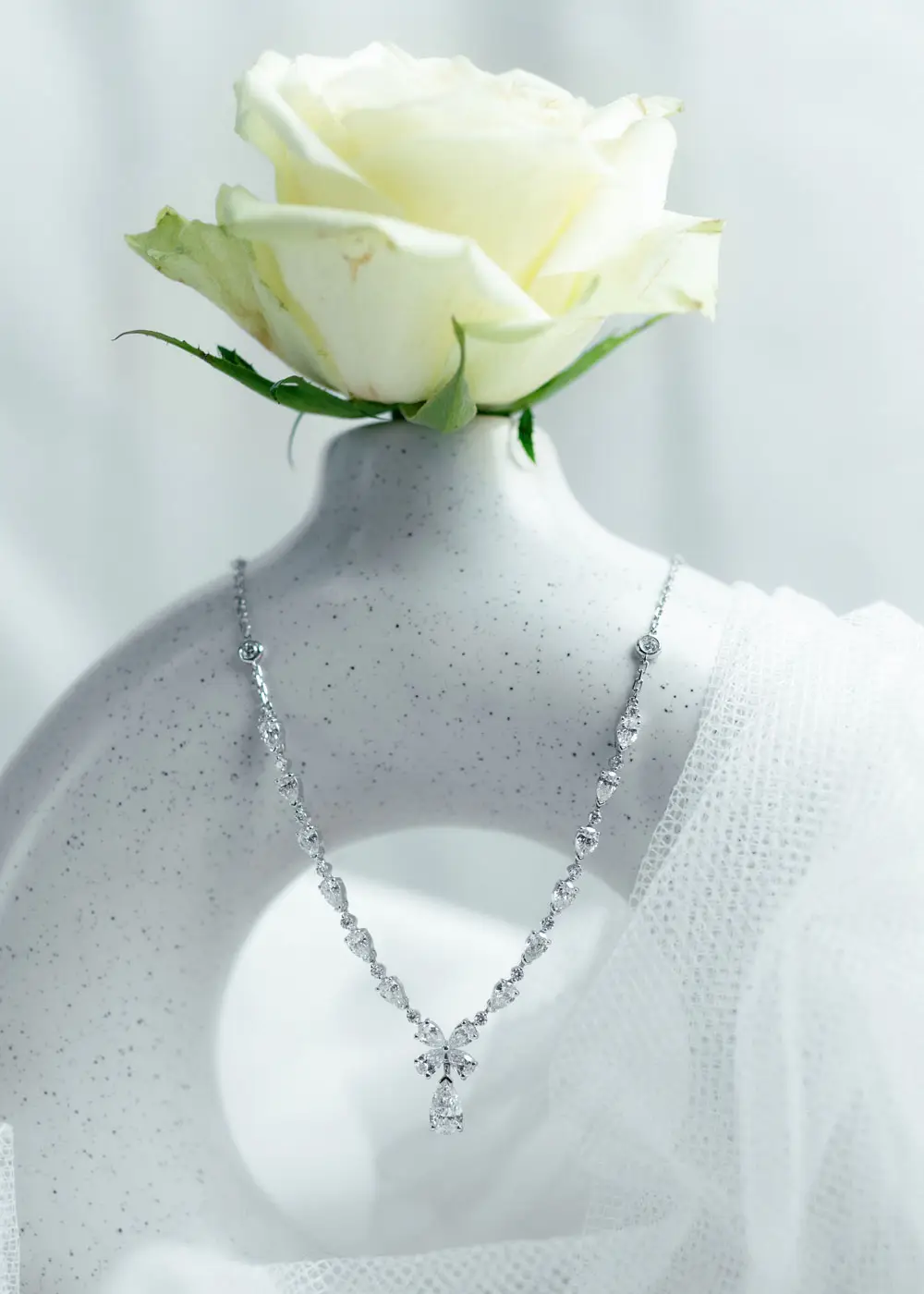 Trung tâm là viên kim cương tự nhiên cắt hình giọt nước (Pear), trọng lượng 0,70 ct, màu F, độ tinh khiết VS. Xung quanh là 4 viên kim cương Pear (0,40 ct) và 12 viên kim cương lớn hơn (3,00 ct) màu D, độ tinh khiết SI1, cùng 12 viên kim cương tròn (Round) tổng cộng 0,25 ct màu F, độ tinh khiết SI, tạo nên hiệu ứng ánh sáng rực rỡ và sang trọng.
