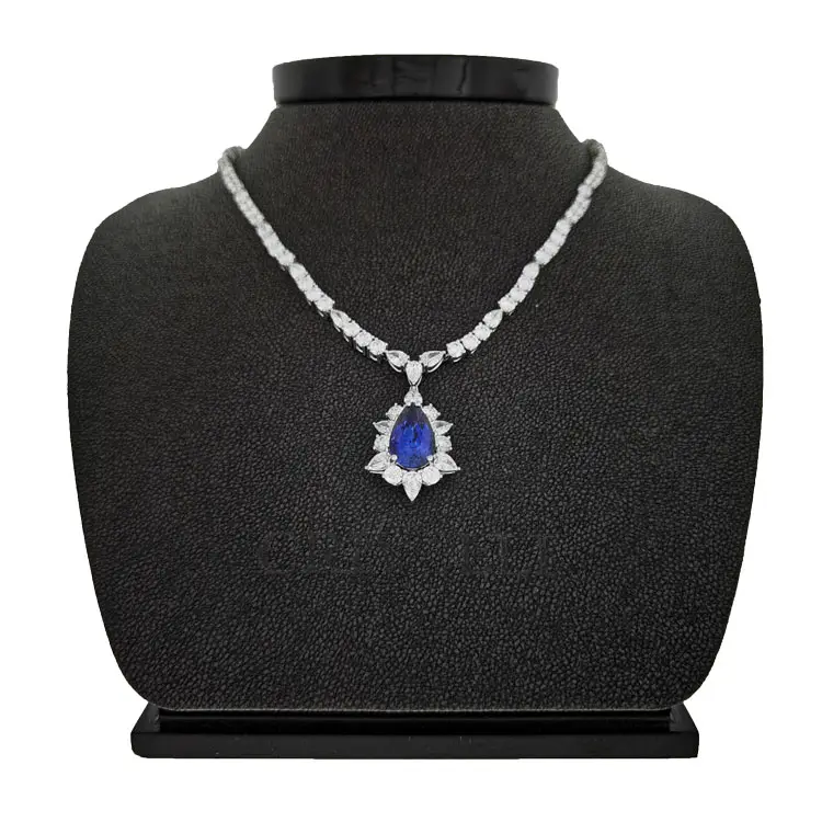 Dây chuyền Beny Jewellery gắn sapphire và kim cương là kiệt tác thể hiện sự sang trọng và tinh tế bậc nhất. Ở trung tâm là viên sapphire tự nhiên 8,17 ct cắt dáng giọt lệ (Pear), mang sắc xanh sâu thẳm tượng trưng cho trí tuệ, bình an và quyền lực. Bao quanh viên đá chủ là vòng kim cương tỏa sáng như vầng hào quang, tạo nên tổng thể cân đối và quyến rũ.
