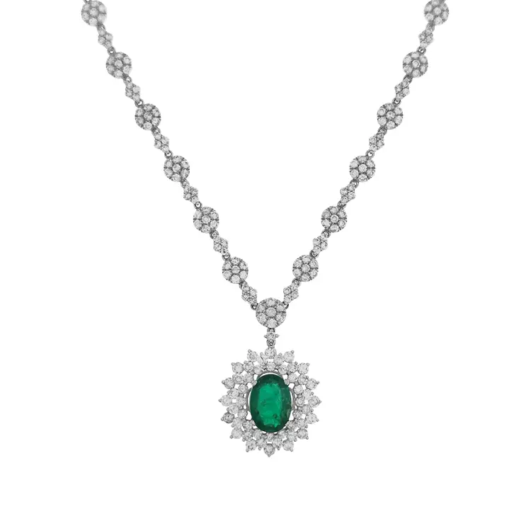 Tâm điểm của dây chuyền là viên ngọc lục bảo tự nhiên nặng 2,69 ct (11,00 × 7,75 mm), được bao quanh bởi 420 viên kim cương tự nhiên tổng cộng 10,42 ct (1,10–1,70 mm, màu H, độ trong VS). Sự kết hợp giữa sắc xanh thẳm và ánh sáng lung linh của kim cương mang đến hiệu ứng quyến rũ và cao quý.