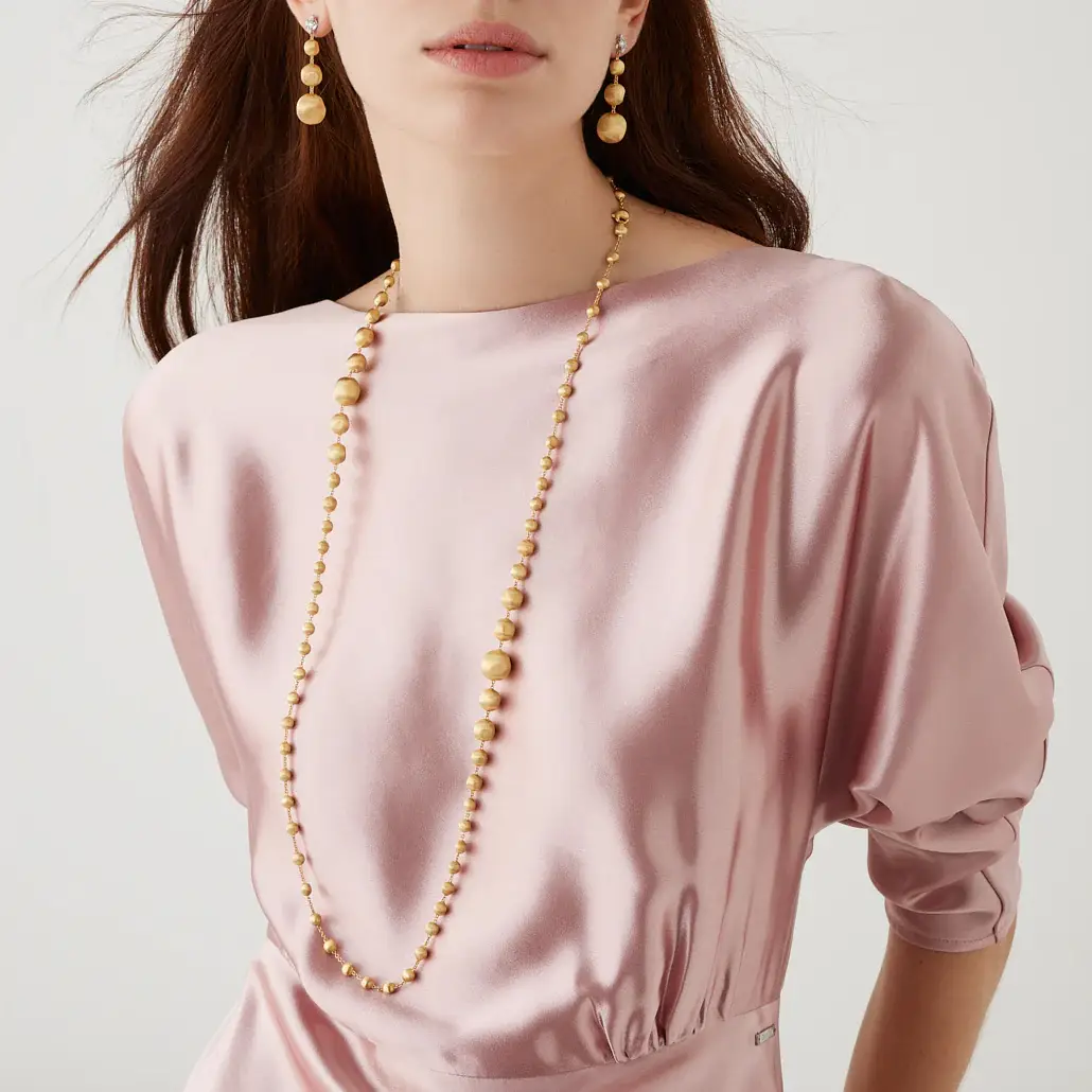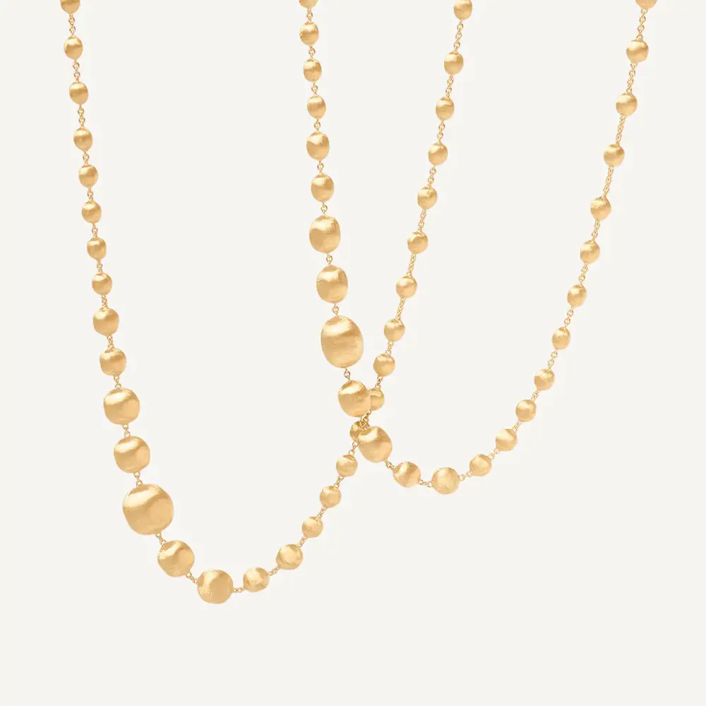 Sợi dây chuyền cao cấp từ bộ sưu tập Marco Bicego Africa được chế tác bằng vàng 18kt (750/1000) với bề mặt mờ sang trọng, tạo nên vẻ mềm mại và đẳng cấp đặc trưng. Chiều dài 92 cm cho phép nhiều cách đeo linh hoạt: đeo dài, quấn hai vòng, hoặc phối lớp cùng trang sức khác.