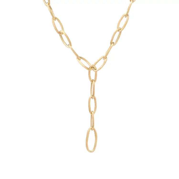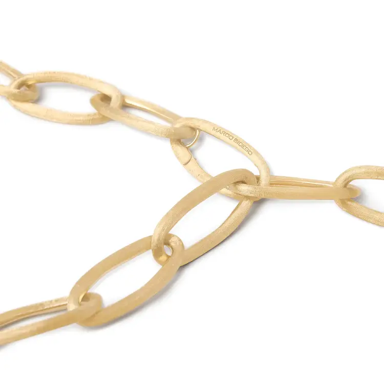 Chiếc dây chuyền tinh tế này thuộc bộ sưu tập Marco Bicego Jaipur Link, được chế tác từ vàng 18 kt (750/1000) với sự kết hợp hài hòa giữa bề mặt bóng và mờ. Độ dài 46 cm giúp dây chuyền nằm ôm sát xương quai xanh, mang lại vẻ sang trọng và hiện đại.