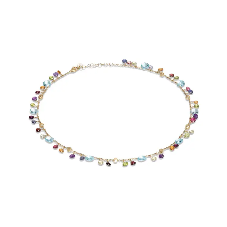 Bộ sưu tập Paradise là lời ca ngợi màu sắc, ánh sáng và niềm vui cuộc sống. Marco Bicego kết hợp những sợi dây chuyền vàng 18K tinh xảo với bảng màu đá quý rực rỡ – từ tourmaline, aquamarine cho tới thạch anh và topaz. Kết quả là những món trang sức tràn đầy năng lượng tươi vui, gợi nhớ đến bãi biển ngập nắng và không khí tự do của mùa hè.