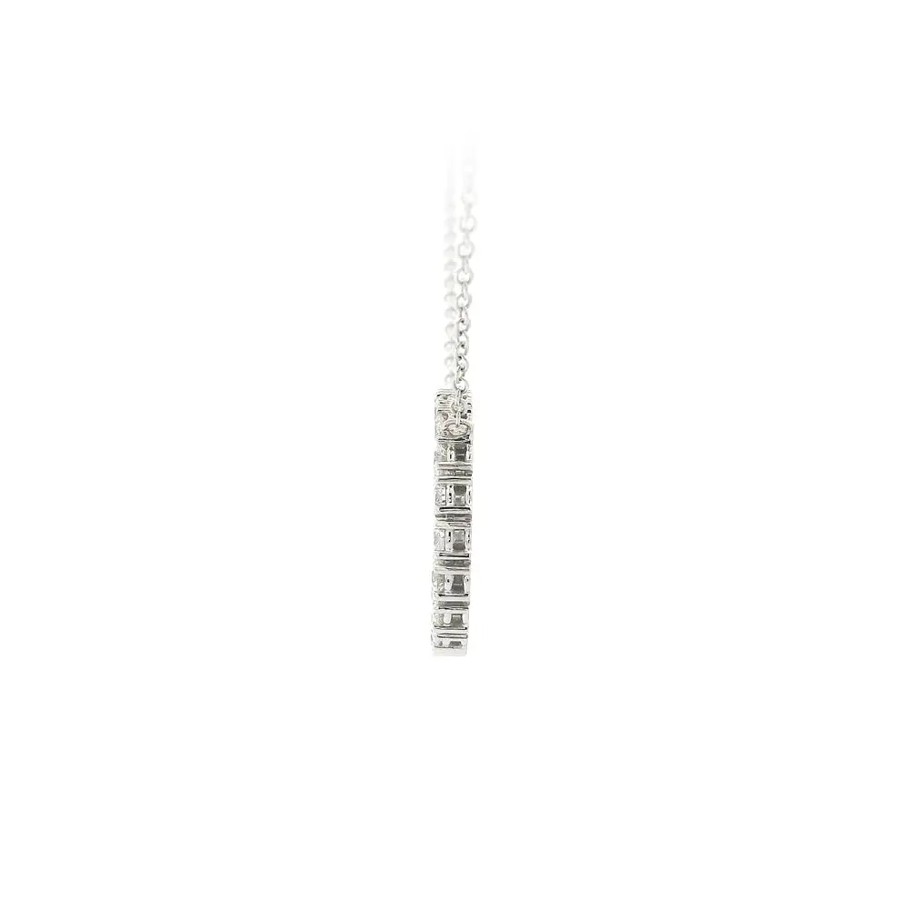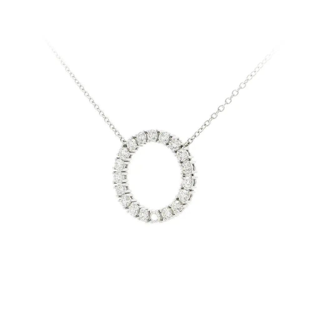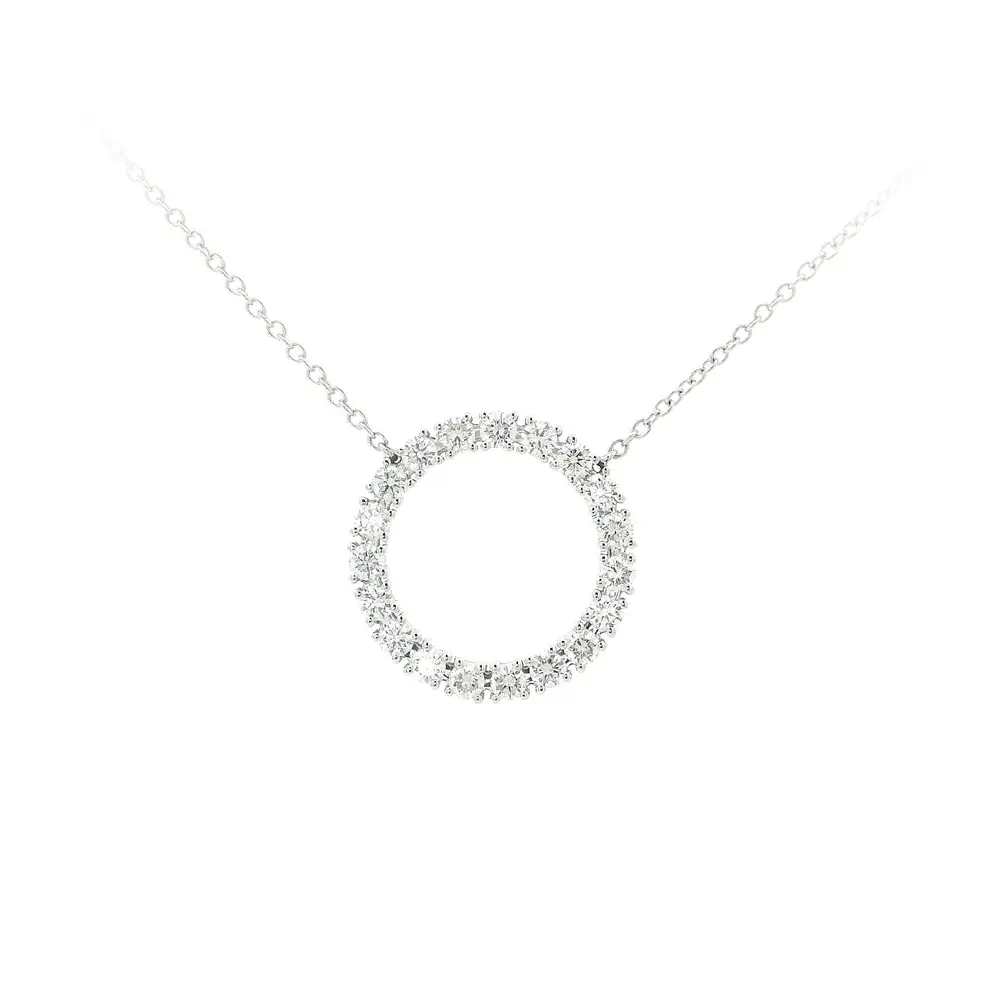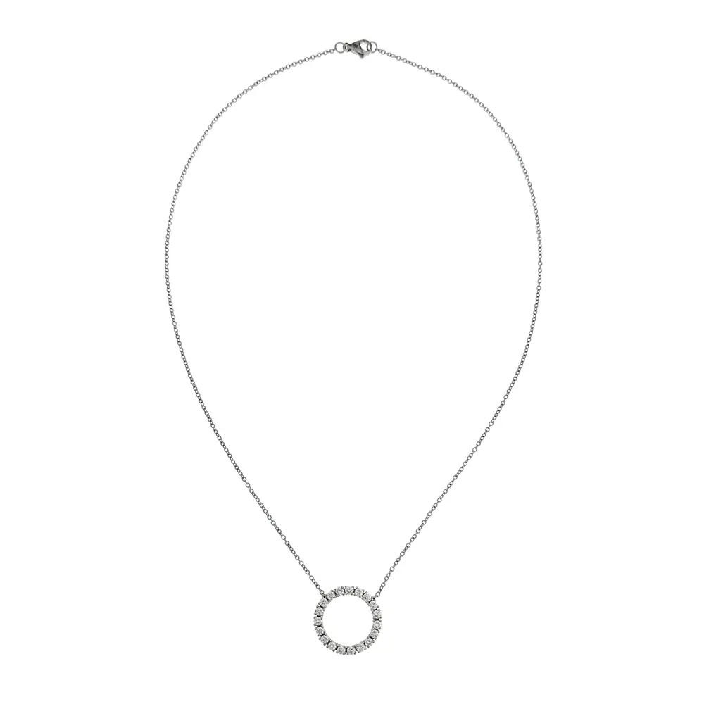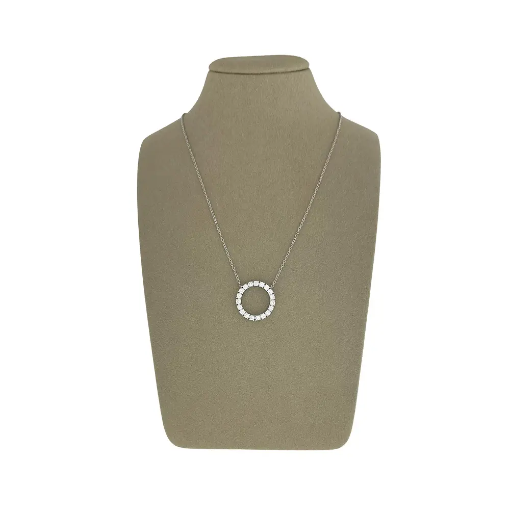 Chiếc vòng cổ bằng vàng trắng 18K sang trọng này là sự thể hiện hoàn hảo của sự thanh lịch và thiết kế vượt thời gian. Dây chuyền mảnh mai dài 42cm ôm sát cổ một cách thoải mái và tinh tế, trong khi mặt dây chuyền tròn được đính 1.20 carat kim cương cắt G và độ trong suốt VS, mang đến ánh sáng lấp lánh độc đáo và vẻ sang trọng cho trang sức.