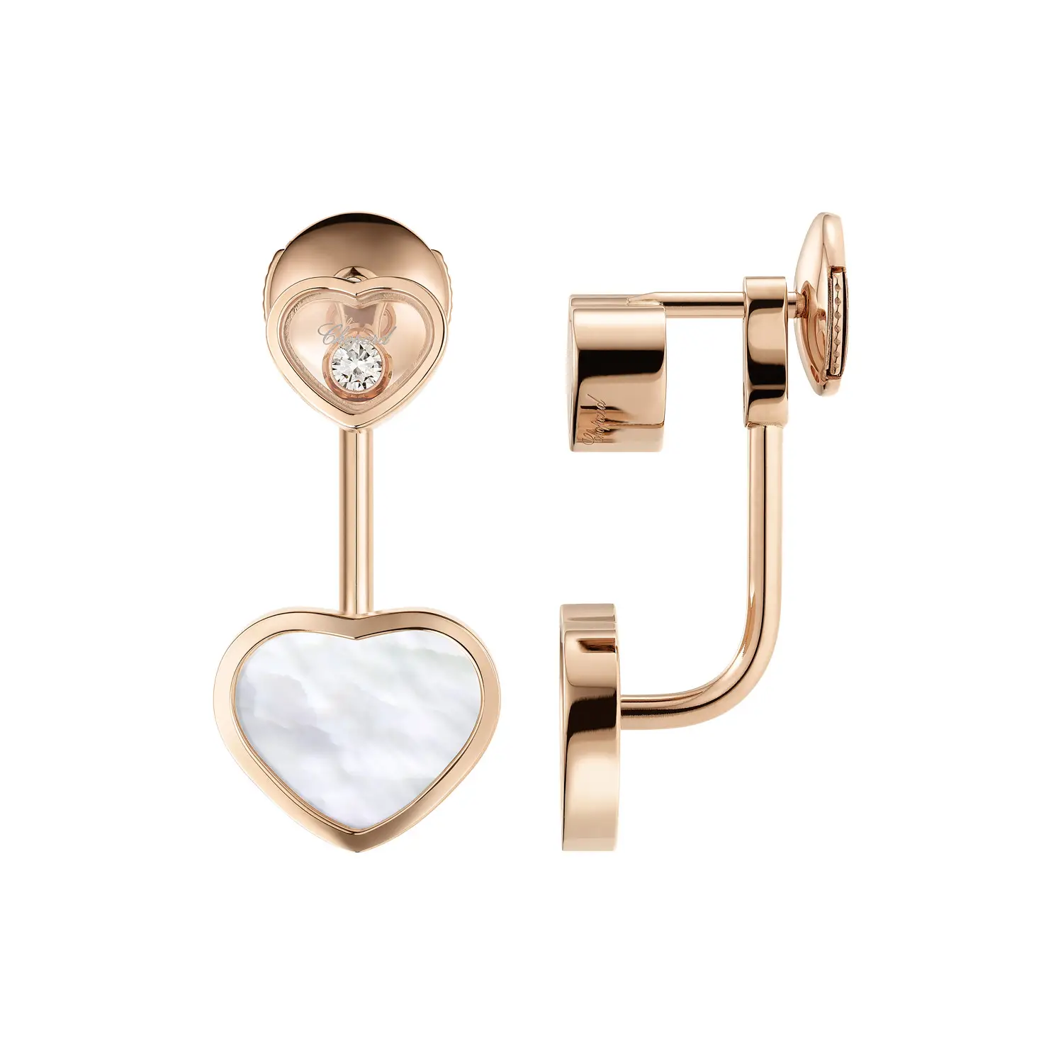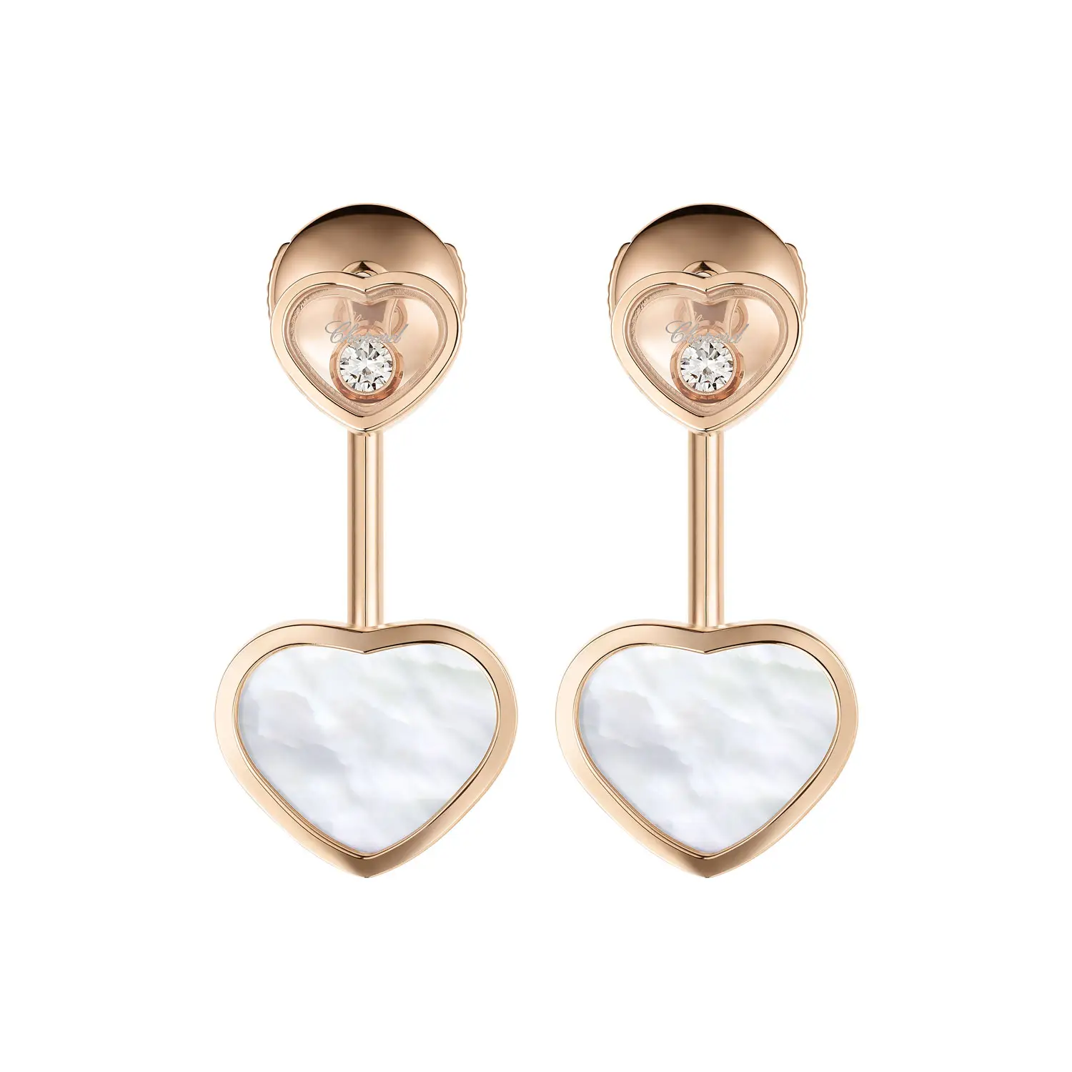 Đôi bông tai Chopard Happy Hearts 83A082-5301 là sự kết hợp hoàn hảo giữa vẻ đẹp lãng mạn và thanh lịch. Được chế tác từ vàng hồng 18k đạt chuẩn đạo đức, bông tai được trang trí bằng trái tim xà cừ trắng và những viên kim cương cắt tròn (tổng trọng lượng khoảng 0,10 ct) lấp lánh giữa hai lớp tinh thể sapphire – chi tiết đặc trưng của bộ sưu tập Happy Hearts, tượng trưng cho niềm vui và tự do.