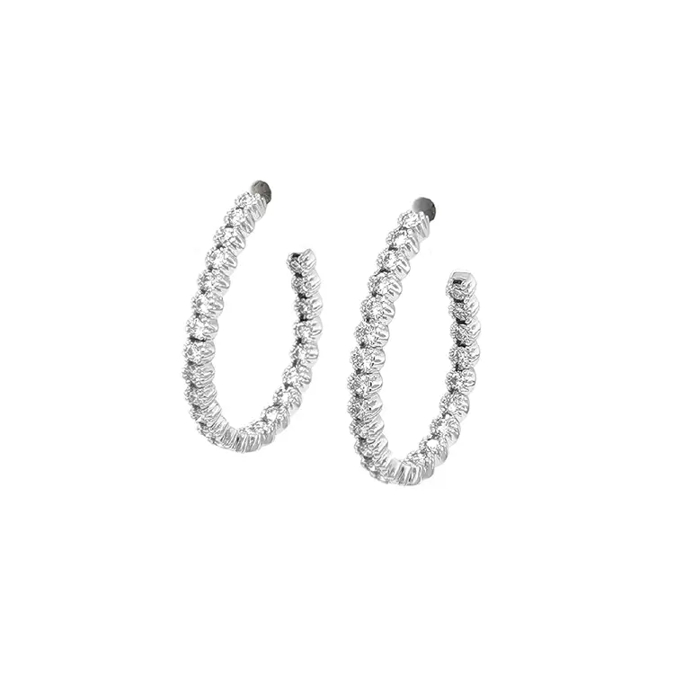 Cặp hoa tai vòng tròn kim cương đến từ thương hiệu Crieri được chế tác từ vàng trắng 18 kt (750/1000), với bề mặt đánh bóng sáng bóng, mang lại vẻ sang trọng và tinh tế. Thiết kế dạng chốt bấm (puzeta) giúp đeo dễ dàng và chắc chắn.