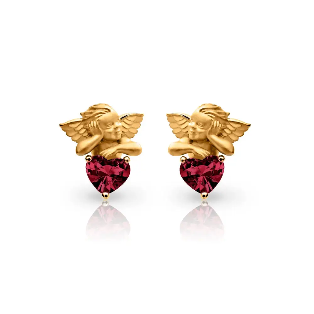 Đá trung tâm là 2 viên garnet đỏ tự nhiên cắt hình Heart (trái tim), mang lại điểm nhấn ấm áp và biểu tượng cảm xúc. Mỗi viên garnet nổi bật trên nền kim loại vàng, tôn lên ý tưởng thiết kế My Angel.
