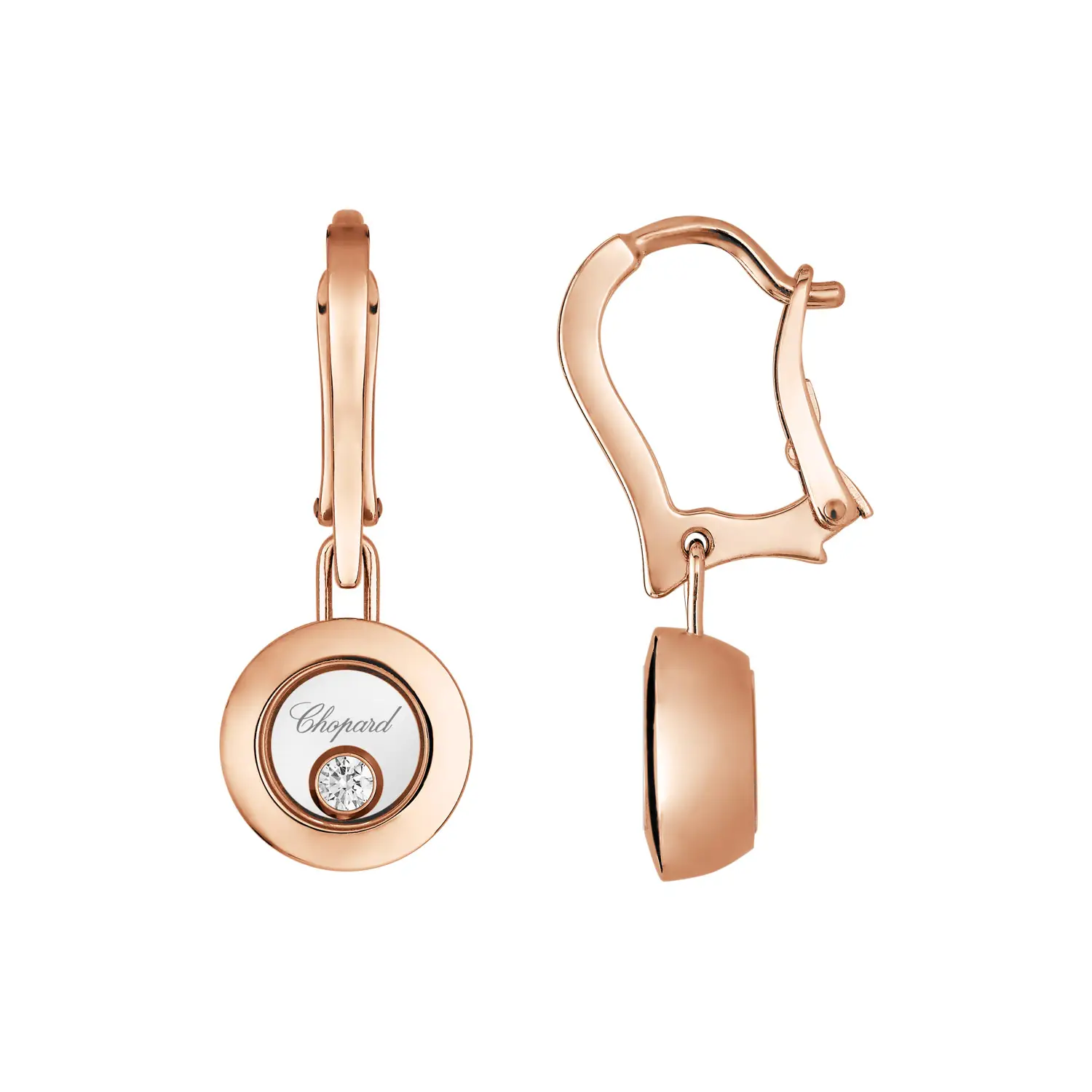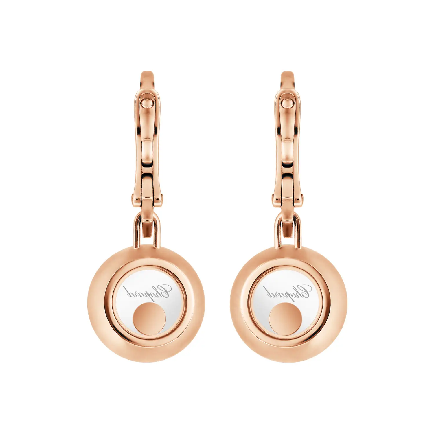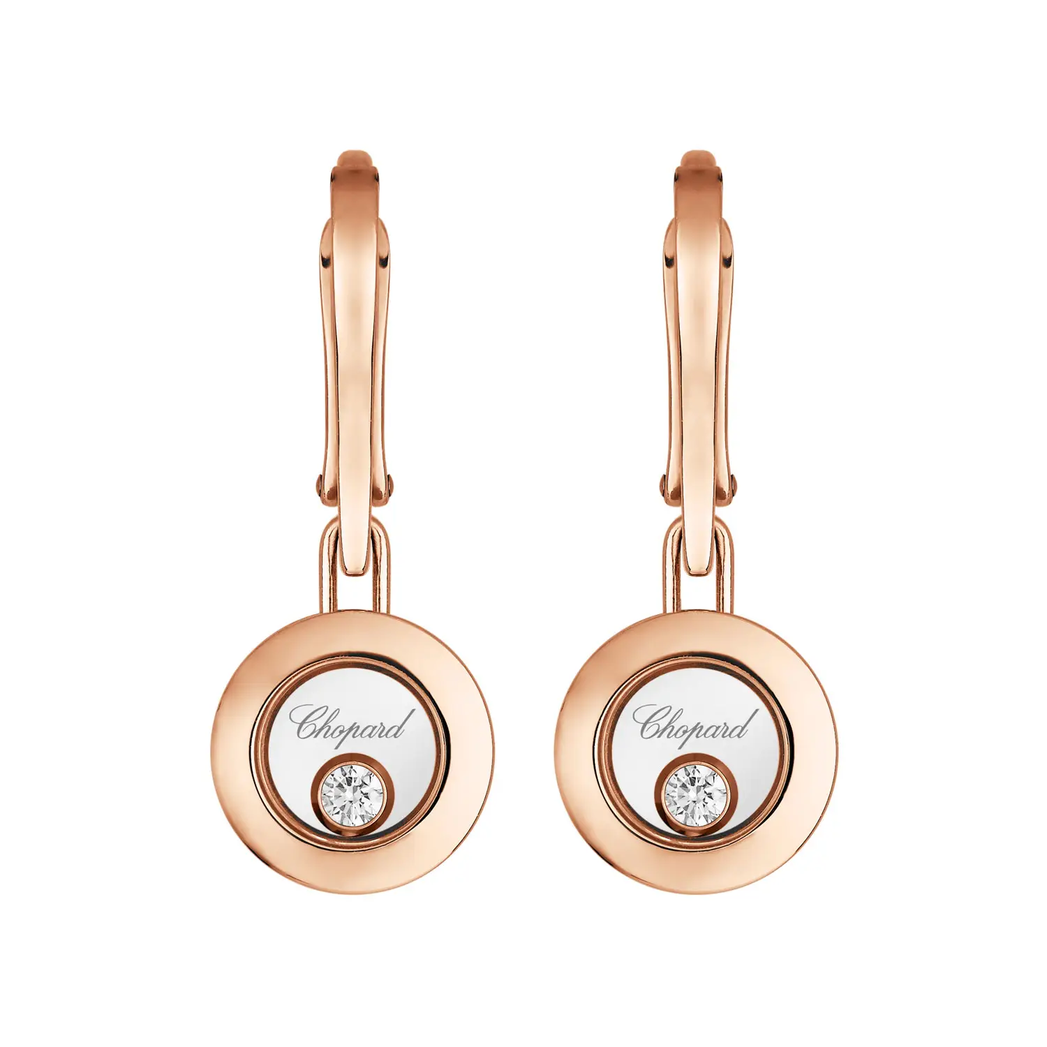 Đôi bông tai Chopard Happy Diamonds Icons 83A017-5301 thể hiện sự hài hòa hoàn hảo giữa chuyển động, ánh sáng và vẻ thanh lịch. Được chế tác từ vàng hồng 18k đạt chuẩn đạo đức, bông tai được gắn những viên kim cương cắt tròn (tổng trọng lượng khoảng 0,10 ct) lấp lánh tự do giữa hai lớp tinh thể sapphire – chi tiết đặc trưng của bộ sưu tập Happy Diamonds, tượng trưng cho niềm vui, tự do và nét nữ tính.