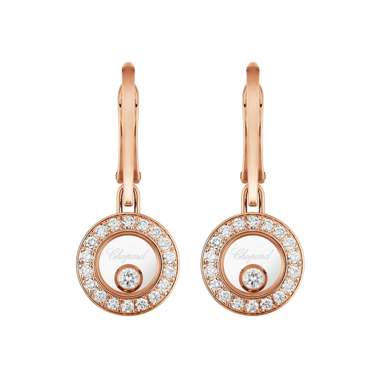 Đôi bông tai Chopard Happy Diamonds Icons 83A017-5401 thể hiện niềm vui và sự tinh tế đặc trưng của bộ sưu tập Happy Diamonds. Được chế tác từ vàng hồng 18k đạt chuẩn đạo đức, bông tai được đính những viên kim cương cắt tròn (tổng trọng lượng khoảng 0,36 ct), trong đó một số viên có thể chuyển động tự do giữa hai lớp tinh thể sapphire – biểu tượng của ánh sáng, tự do và hạnh phúc.