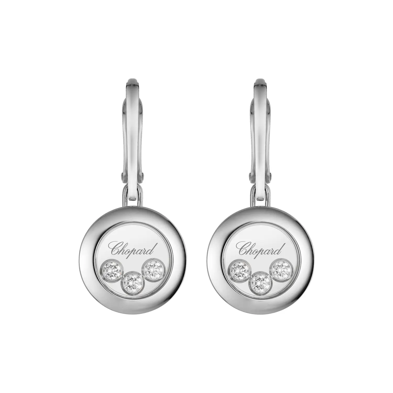 Đôi bông tai Chopard Happy Diamonds Icons 83A018-1301 thể hiện vẻ đẹp thuần khiết và ánh sáng rạng ngời của niềm vui. Được chế tác từ vàng trắng 18k đạt chuẩn đạo đức, bông tai được gắn những viên kim cương cắt tròn chuyển động tự do (tổng trọng lượng khoảng 0,30 ct) lấp lánh giữa hai lớp tinh thể sapphire – chi tiết đặc trưng của bộ sưu tập Happy Diamonds, tượng trưng cho tự do, hạnh phúc và nét nữ tính.