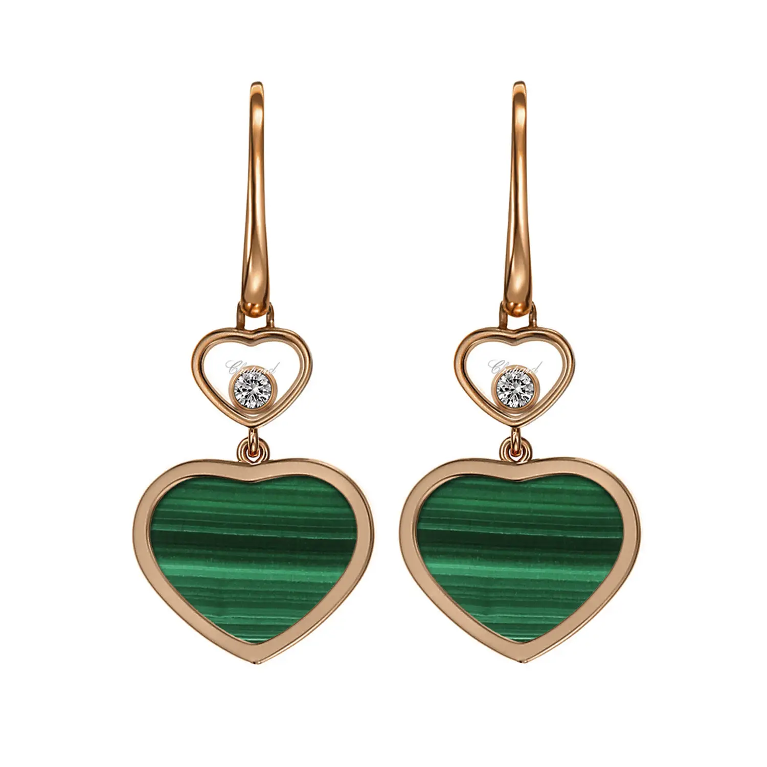 Bông tai Chopard Happy Hearts 837482-5111 thể hiện vẻ đẹp nữ tính và nét sang trọng tươi vui. Được chế tác từ vàng hồng 18 cara có nguồn gốc đạo đức, đôi bông tai được trang trí bằng trái tim đá malachite xanh và kim cương trắng (tổng cộng 0,10 ct) nằm trong những trái tim nhỏ bằng vàng, tạo hiệu ứng lấp lánh khi chuyển động.