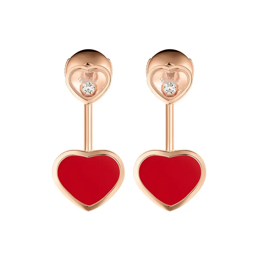 Tâm điểm là 2 viên đá chính hình trái tim (Heart) màu đỏ rực, tạo điểm nhấn cá tính. Vẻ lấp lánh được tăng cường bởi kim cương tổng 0,08 ct (2 viên), giác cắt tròn / Round, màu trắng (nguồn gốc: tự nhiên), độ tinh khiết IF–VVS, cấp màu F–G. Nạm đá chuẩn xác làm nổi bật độ rực rỡ và sự tinh gọn đường nét—một đôi bông tai vượt thời gian, nữ tính và ấn tượng, dễ phối cùng các trang sức Chopard khác.