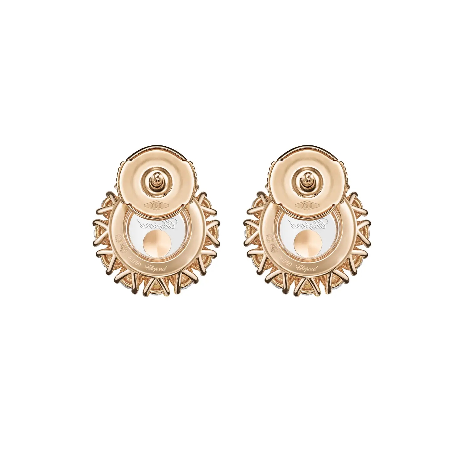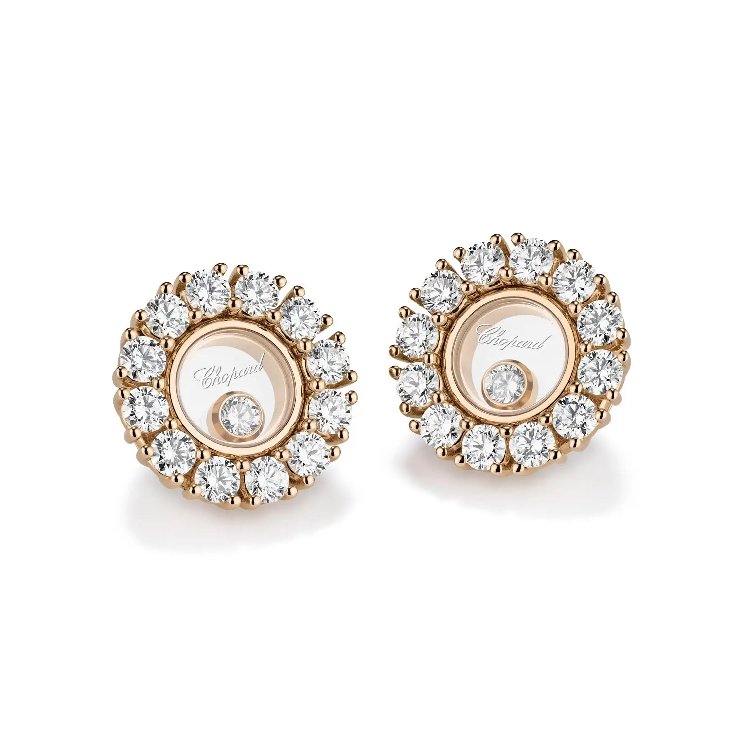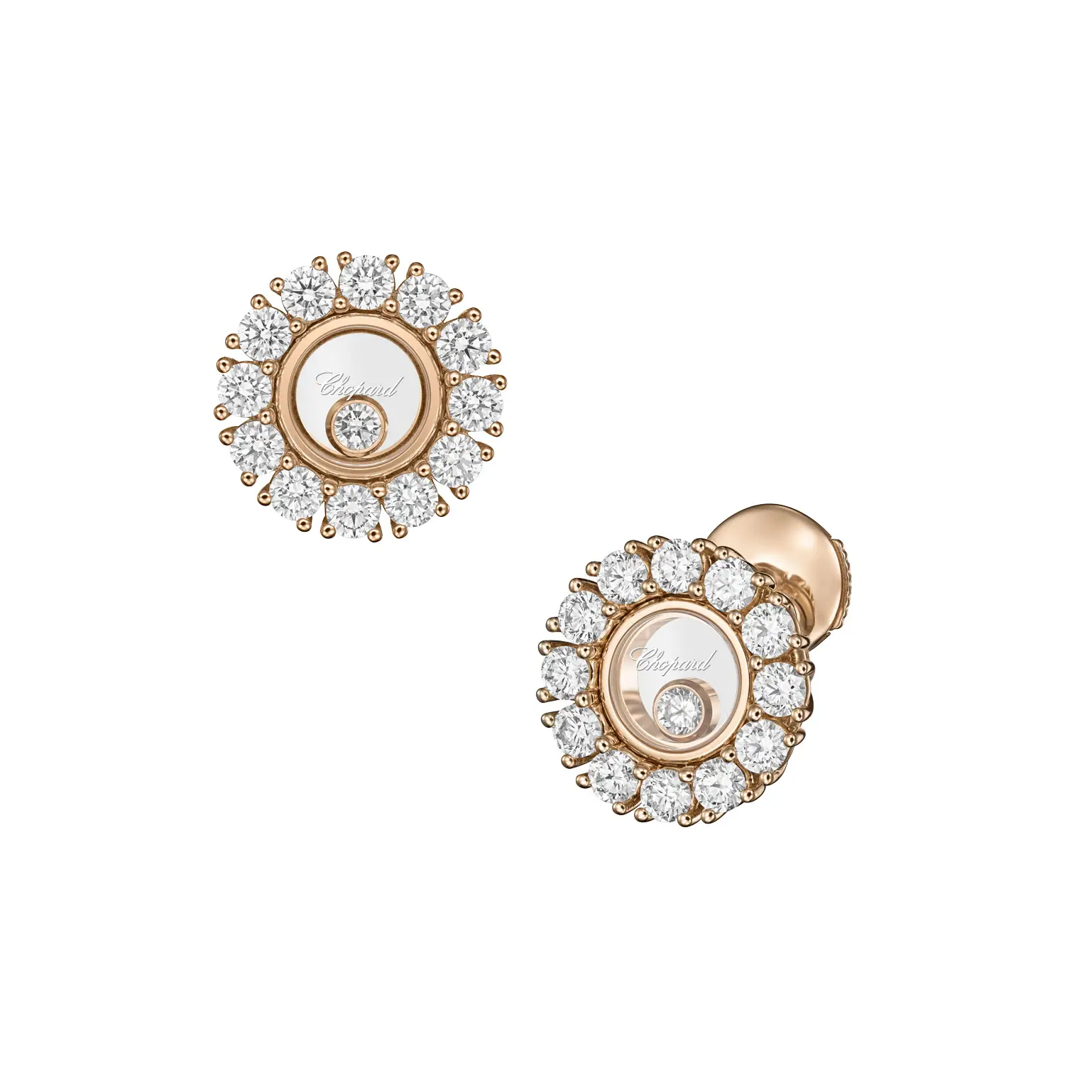 Bông tai Chopard Happy Diamonds 83A609-5001 thể hiện sự thanh lịch, chuyển động và ánh sáng, là tinh hoa của bộ sưu tập Happy Diamonds. Được chế tác từ vàng hồng 18 cara có nguồn gốc đạo đức, đôi bông tai nổi bật với những viên kim cương chuyển động tự do giữa hai lớp kính sapphire, tổng trọng lượng khoảng 1,20 ct.