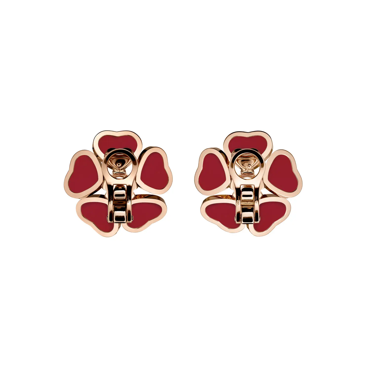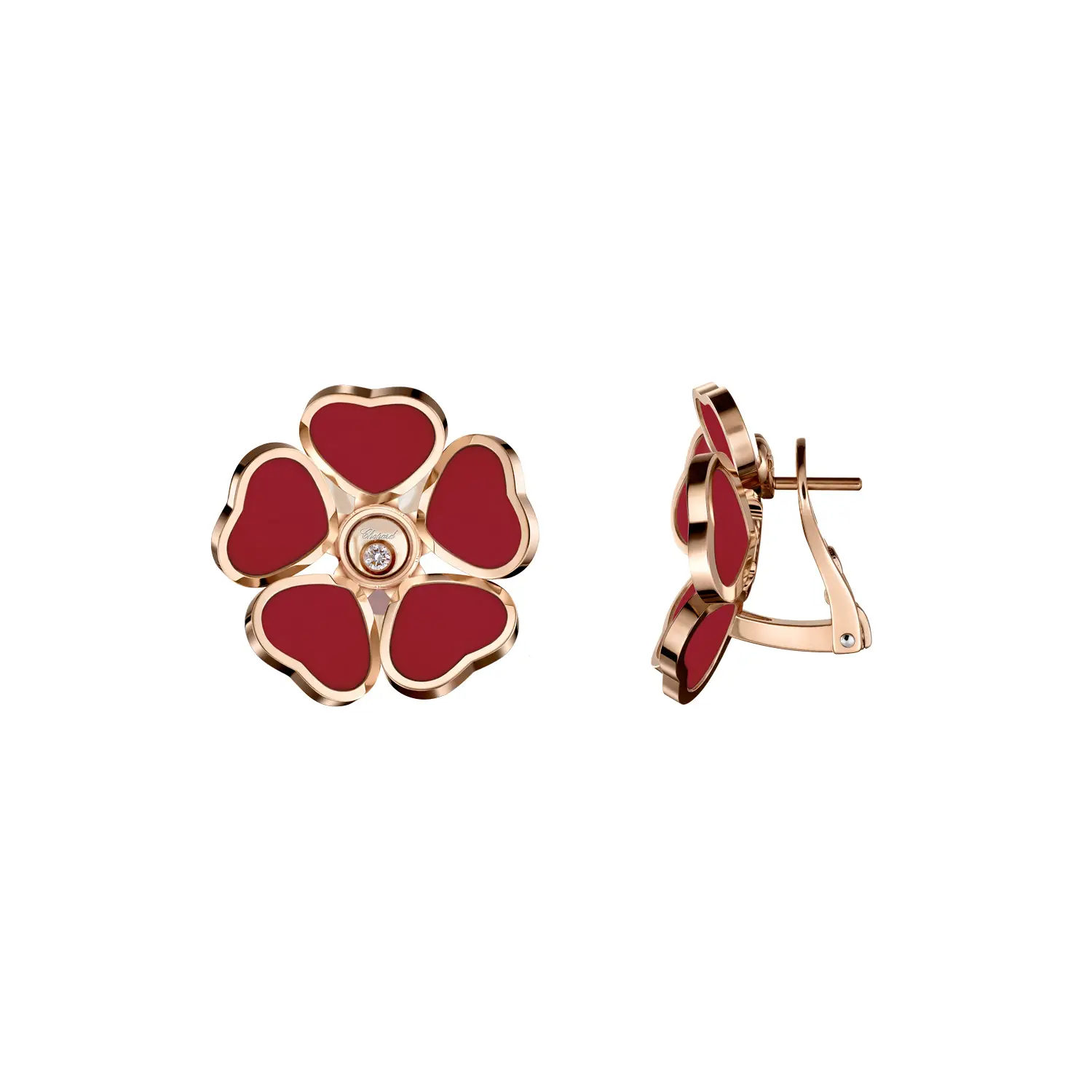 Đôi bông tai Chopard Happy Hearts Flowers 84A085-5811 mang đến sự kết hợp hài hòa giữa biểu tượng trái tim và bông hoa trong thiết kế đầy nữ tính và tinh tế. Được chế tác từ vàng hồng 18k đạt chuẩn đạo đức, bông tai được đính những viên kim cương cắt tròn cùng đá đỏ rực rỡ mang sắc thái của hồng ngọc, tạo điểm nhấn ấm áp và tràn đầy năng lượng.