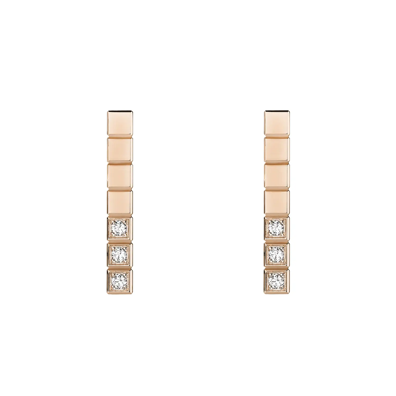 Đôi bông tai Chopard Ice Cube 837702-5002 mang phong cách tối giản hiện đại kết hợp cùng sự sang trọng tinh tế. Được chế tác từ vàng hồng 18k đạt chuẩn đạo đức và đính 6 viên kim cương cắt tròn, tổng trọng lượng 0,06 ct, thiết kế lấy cảm hứng từ hình khối băng đặc trưng của bộ sưu tập Ice Cube.