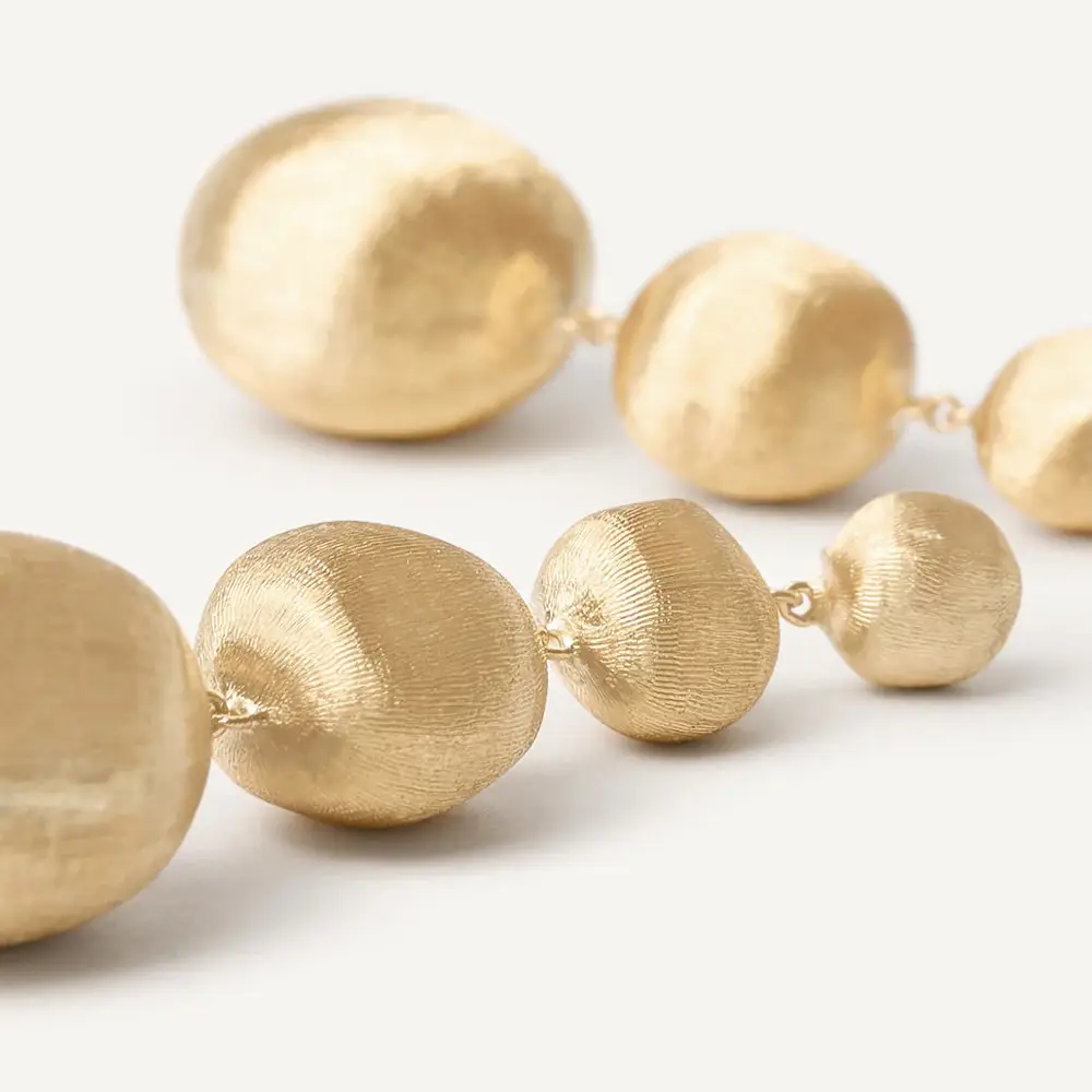 Mỗi món trang sức được chế tác từ vàng 18K, khắc thủ công bằng kỹ thuật bulino mang lại bề mặt mờ mịn, mượt mà như nhung. Đặc trưng của bộ sưu tập là những hạt cầu lớn, tối giản nhưng đầy tinh tế. Africa bao gồm dây chuyền, vòng tay, nhẫn và hoa tai, nhiều mẫu còn được tô điểm bằng kim cương hoặc đá quý rực rỡ.