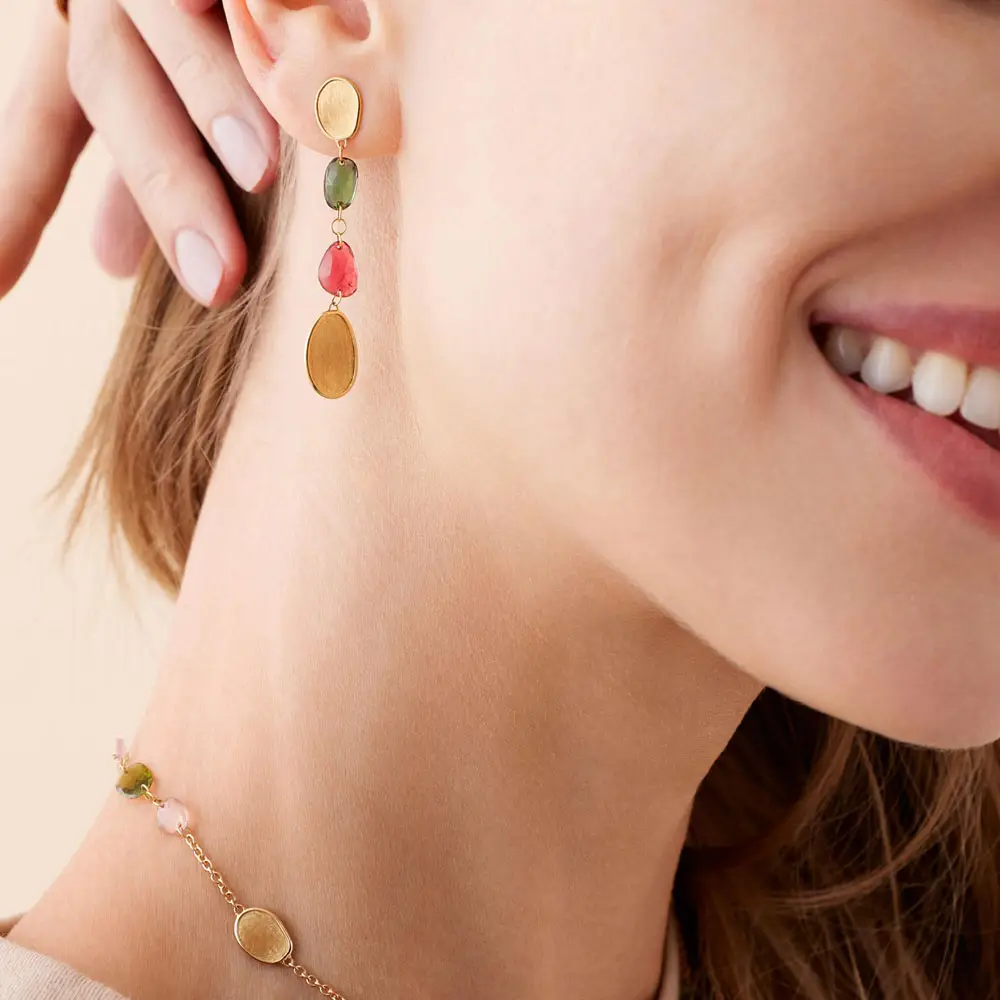 Độ dài của tai là 48,00 mm, tạo nên kiểu dáng rủ sang trọng. Điểm nhấn là 4 viên tourmaline tự nhiên trong bố cục đa màu, khéo léo gắn trong motif Lunaria. Mỗi viên đá được cắt theo kiểu rout / rose, phát triển cùng ánh sáng thành bảng màu sống động. Những chiếc tai này thể hiện triết lý của dòng Lunaria Color — sự cộng hưởng giữa vàng và đá màu tạo nên vẻ đẹp hài hòa sắc thái.